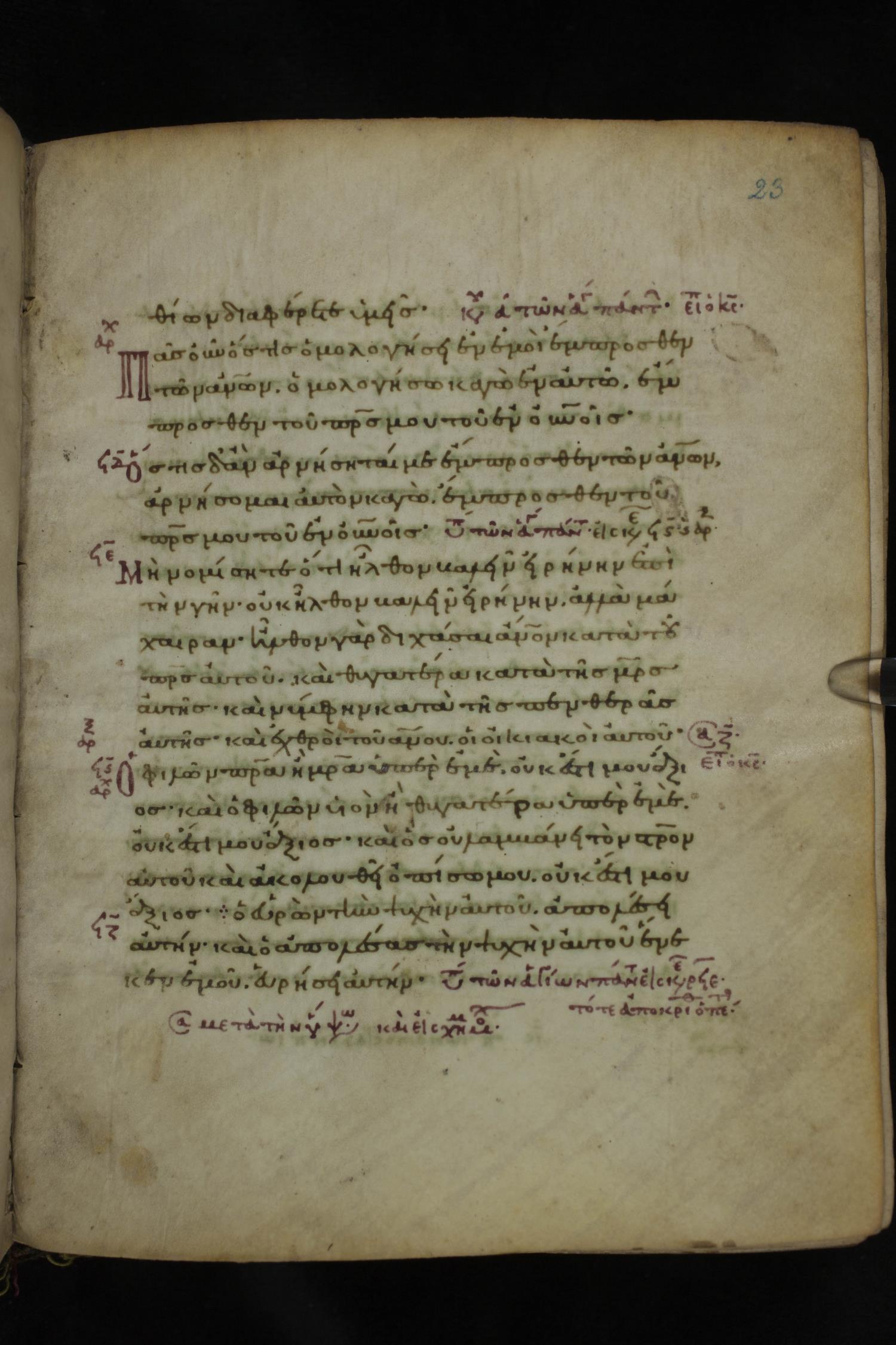Eleventh or twelfth century minuscule of the Gospels on parchment; 231 leaves, 1 column, 21 lines per column. Images were taken at the National Library of Greece in Athens.