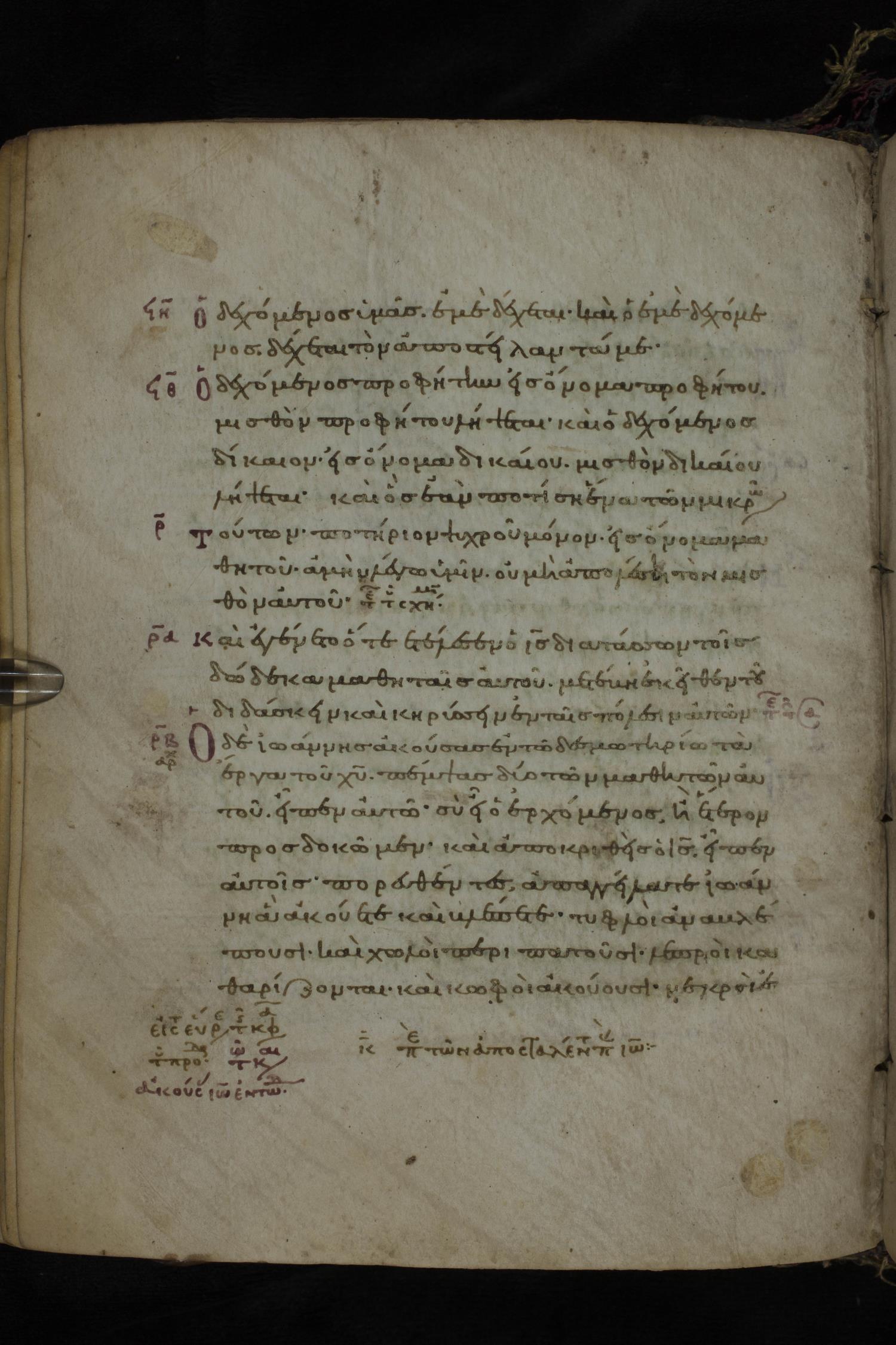 Eleventh or twelfth century minuscule of the Gospels on parchment; 231 leaves, 1 column, 21 lines per column. Images were taken at the National Library of Greece in Athens.
