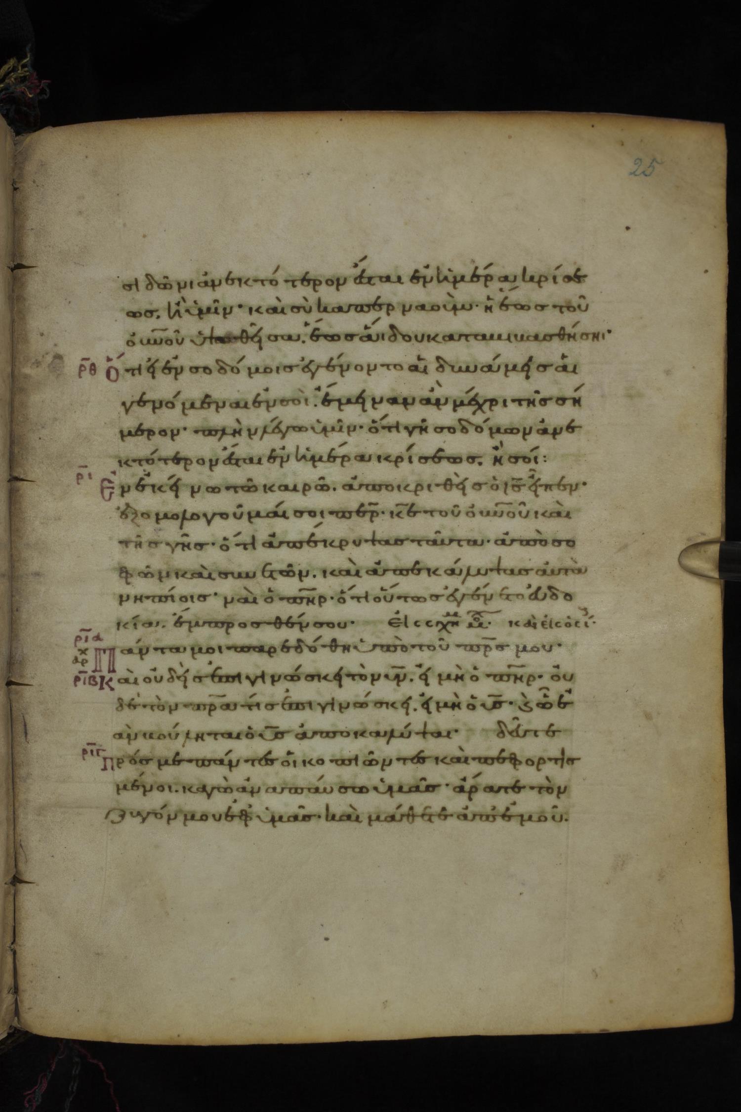Eleventh or twelfth century minuscule of the Gospels on parchment; 231 leaves, 1 column, 21 lines per column. Images were taken at the National Library of Greece in Athens.