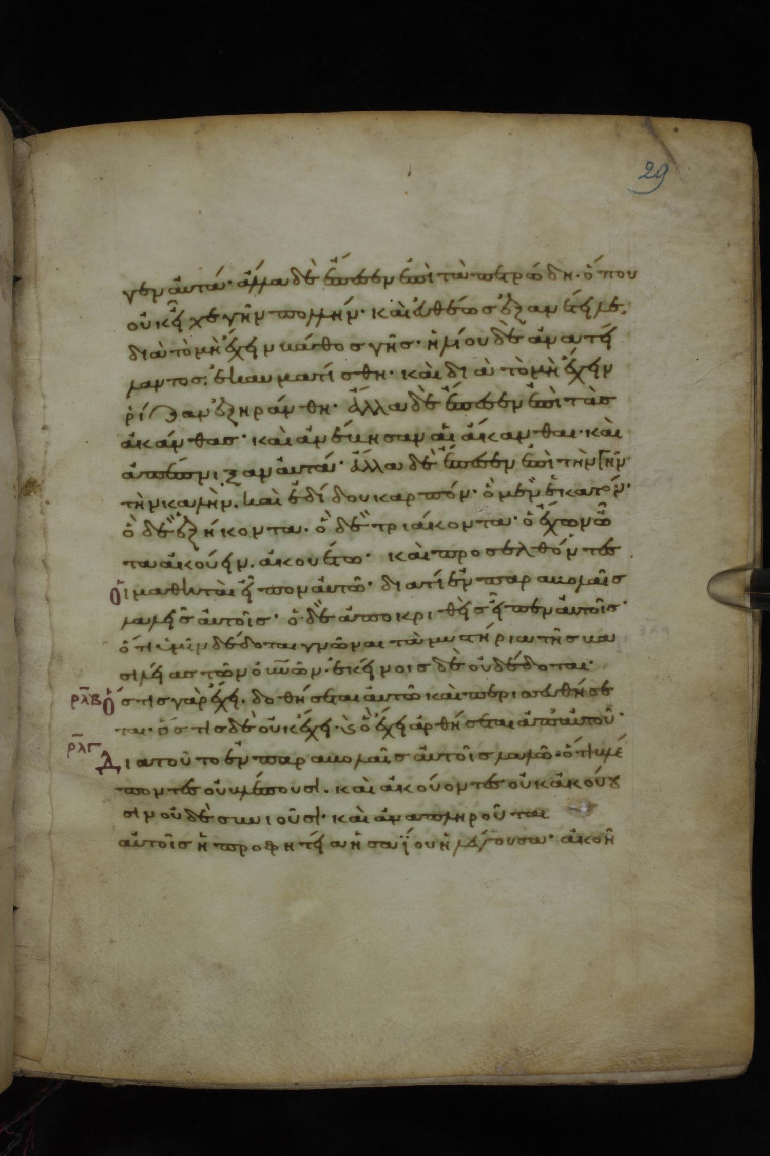 Eleventh or twelfth century minuscule of the Gospels on parchment; 231 leaves, 1 column, 21 lines per column. Images were taken at the National Library of Greece in Athens.