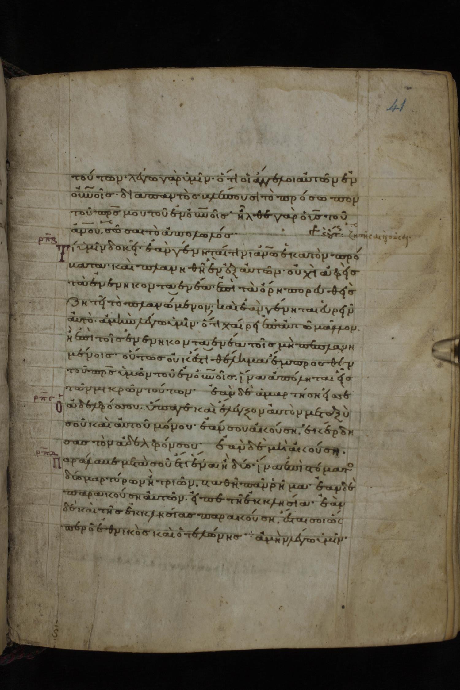 Eleventh or twelfth century minuscule of the Gospels on parchment; 231 leaves, 1 column, 21 lines per column. Images were taken at the National Library of Greece in Athens.
