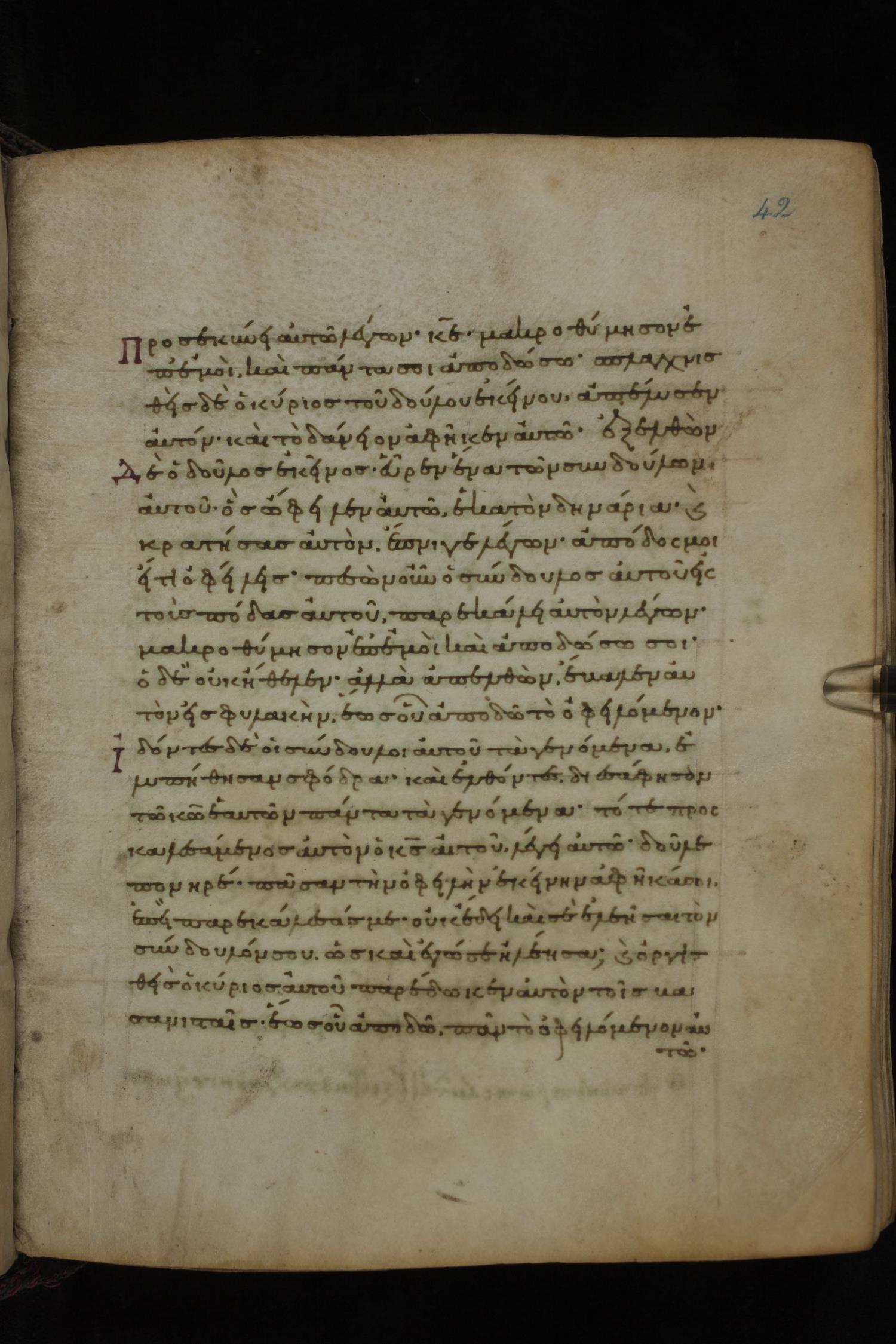 Eleventh or twelfth century minuscule of the Gospels on parchment; 231 leaves, 1 column, 21 lines per column. Images were taken at the National Library of Greece in Athens.