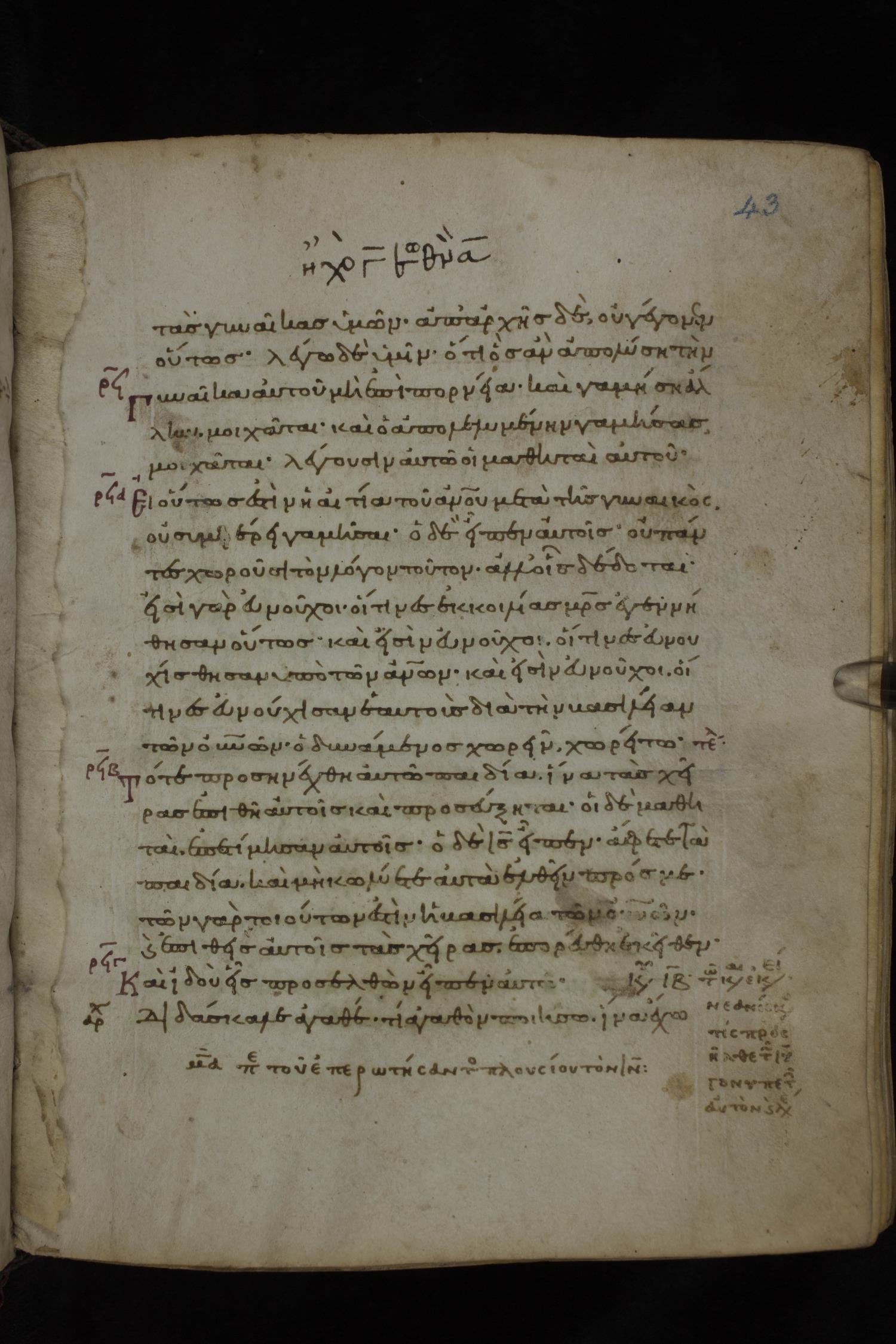 Eleventh or twelfth century minuscule of the Gospels on parchment; 231 leaves, 1 column, 21 lines per column. Images were taken at the National Library of Greece in Athens.