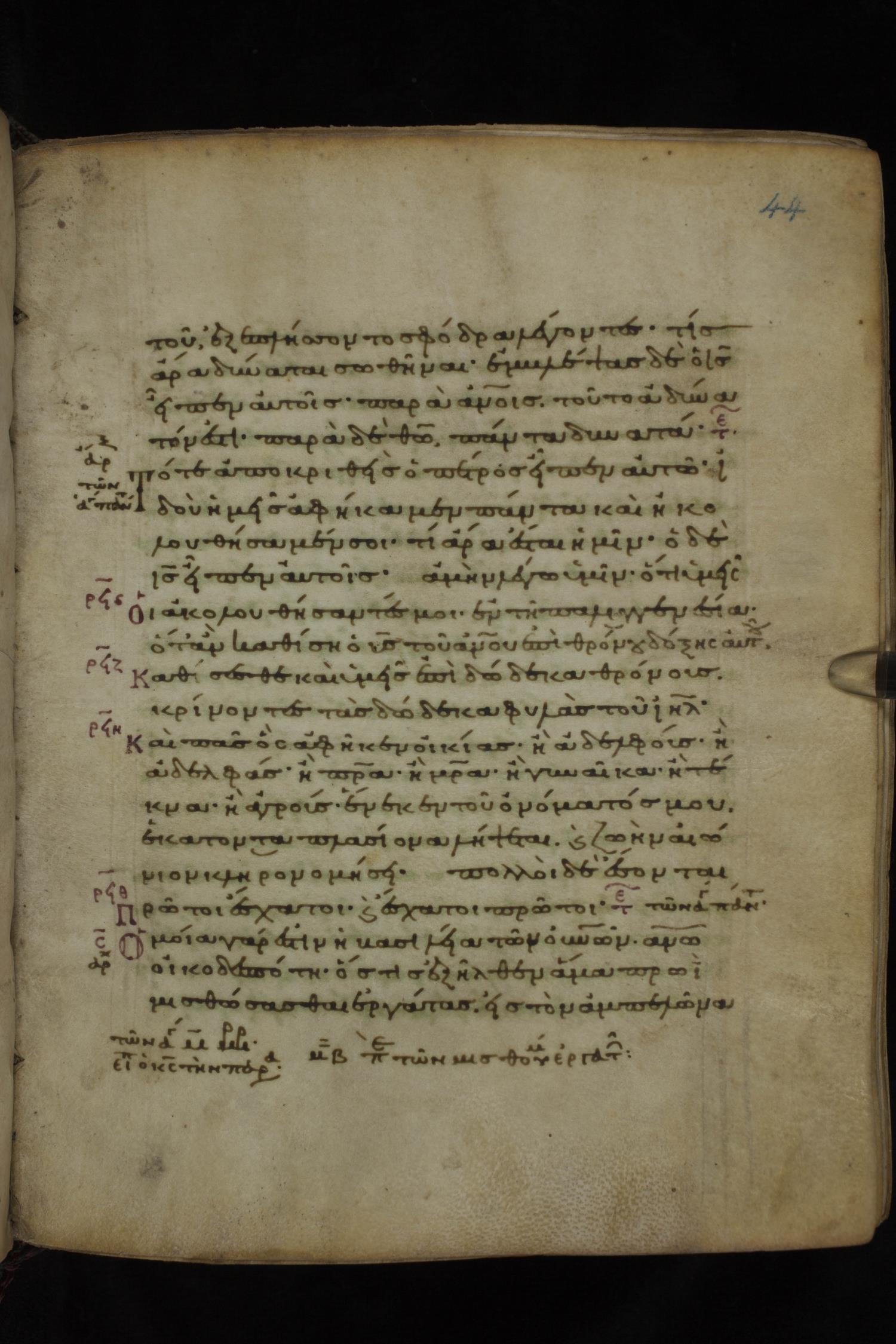 Eleventh or twelfth century minuscule of the Gospels on parchment; 231 leaves, 1 column, 21 lines per column. Images were taken at the National Library of Greece in Athens.