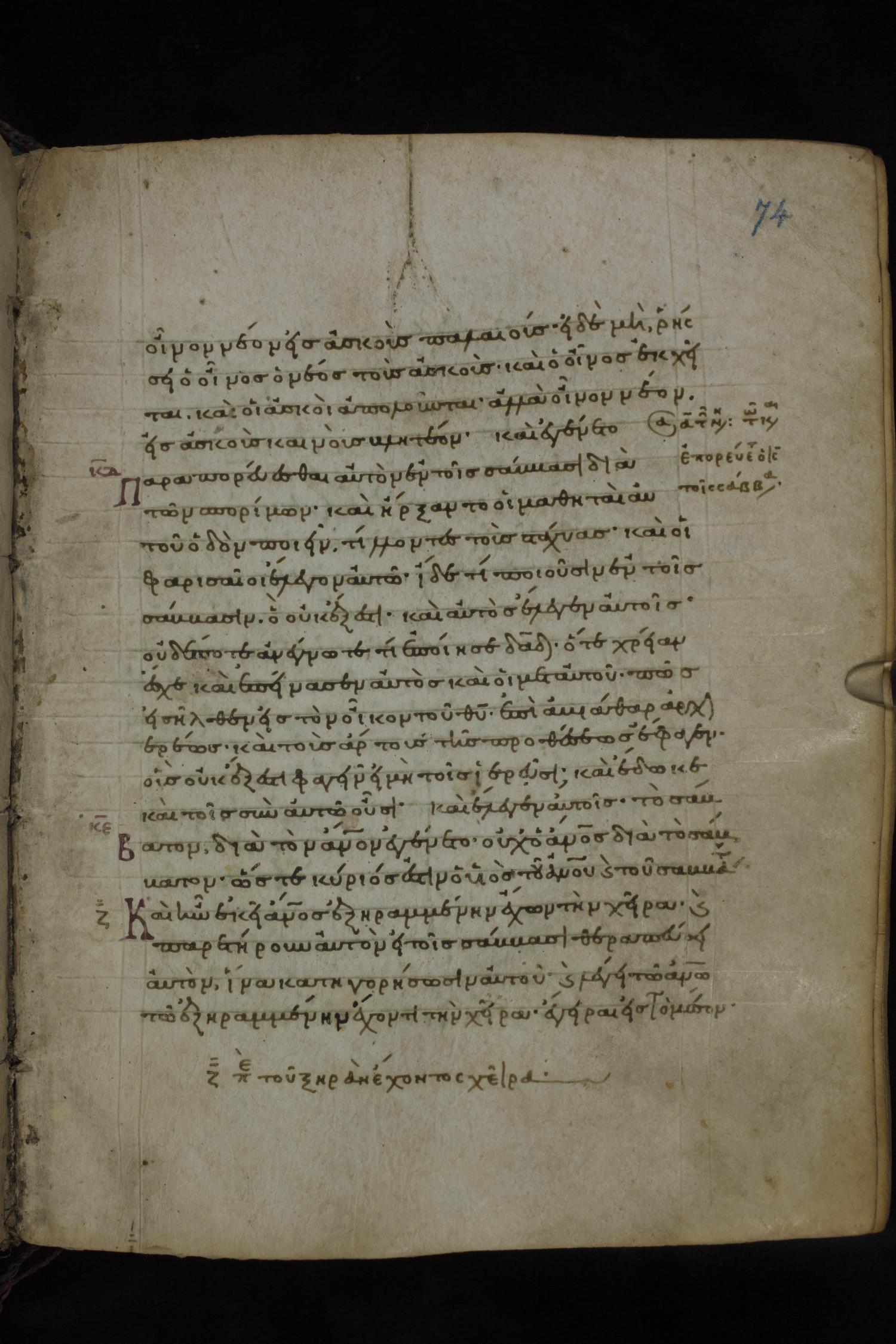 Eleventh or twelfth century minuscule of the Gospels on parchment; 231 leaves, 1 column, 21 lines per column. Images were taken at the National Library of Greece in Athens.