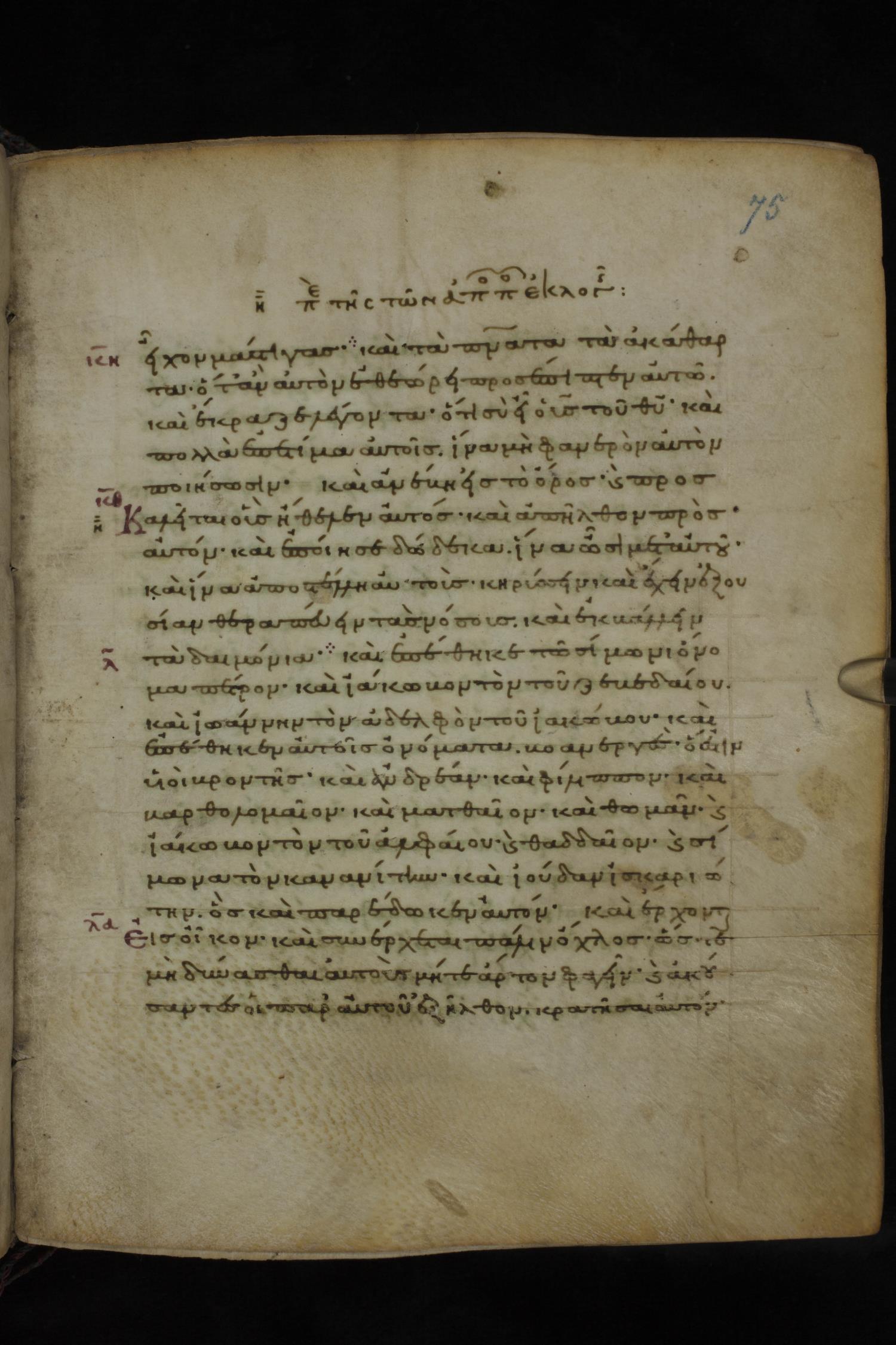 Eleventh or twelfth century minuscule of the Gospels on parchment; 231 leaves, 1 column, 21 lines per column. Images were taken at the National Library of Greece in Athens.