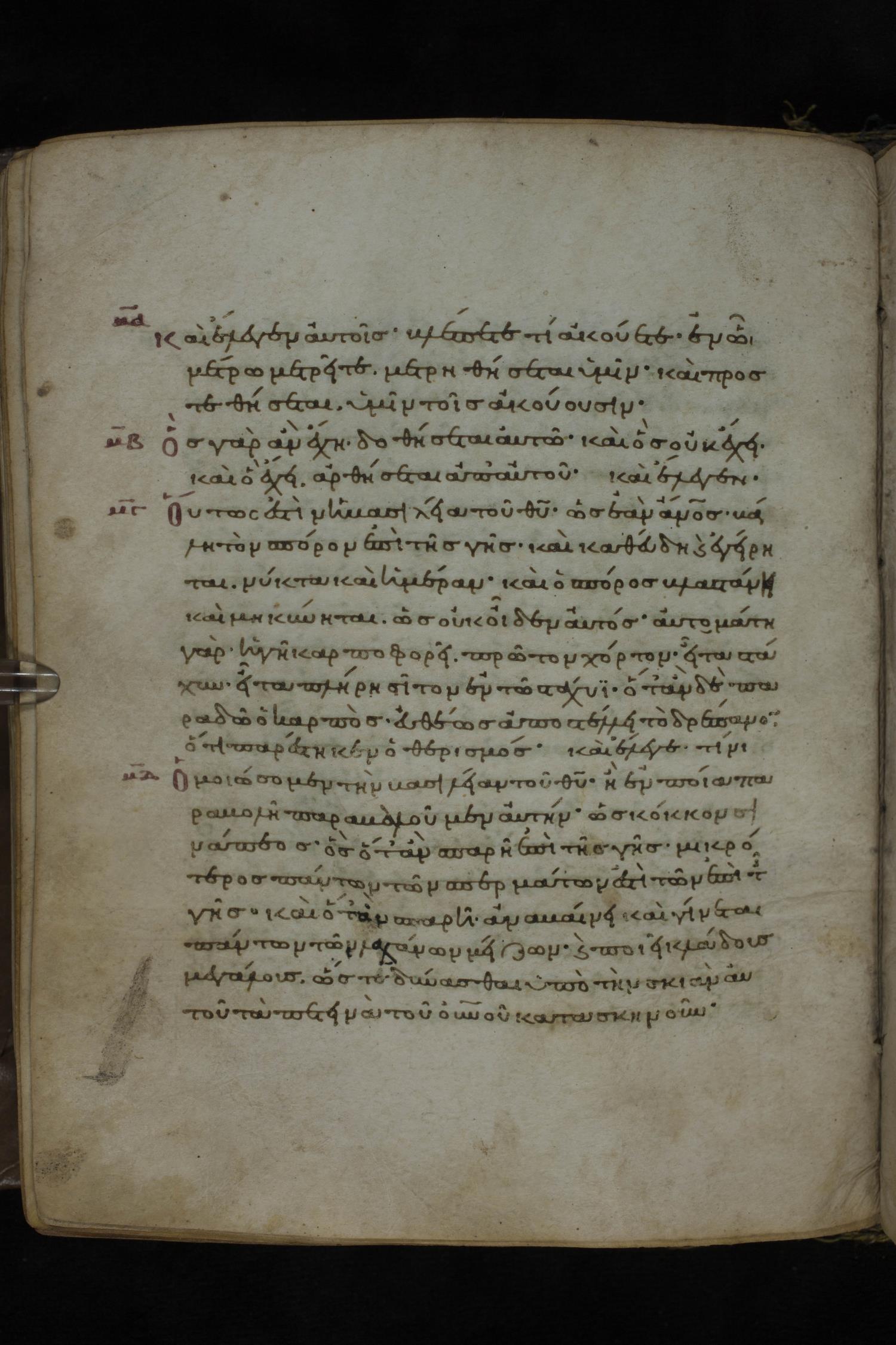 Eleventh or twelfth century minuscule of the Gospels on parchment; 231 leaves, 1 column, 21 lines per column. Images were taken at the National Library of Greece in Athens.