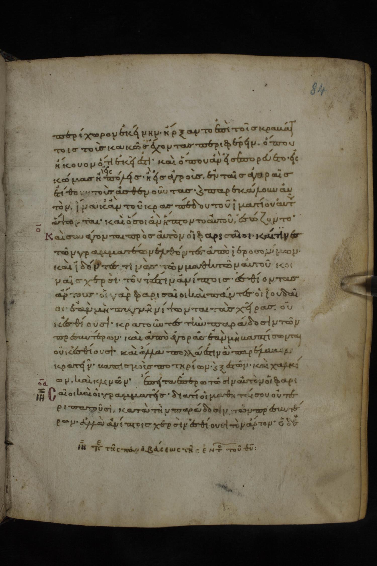 Eleventh or twelfth century minuscule of the Gospels on parchment; 231 leaves, 1 column, 21 lines per column. Images were taken at the National Library of Greece in Athens.