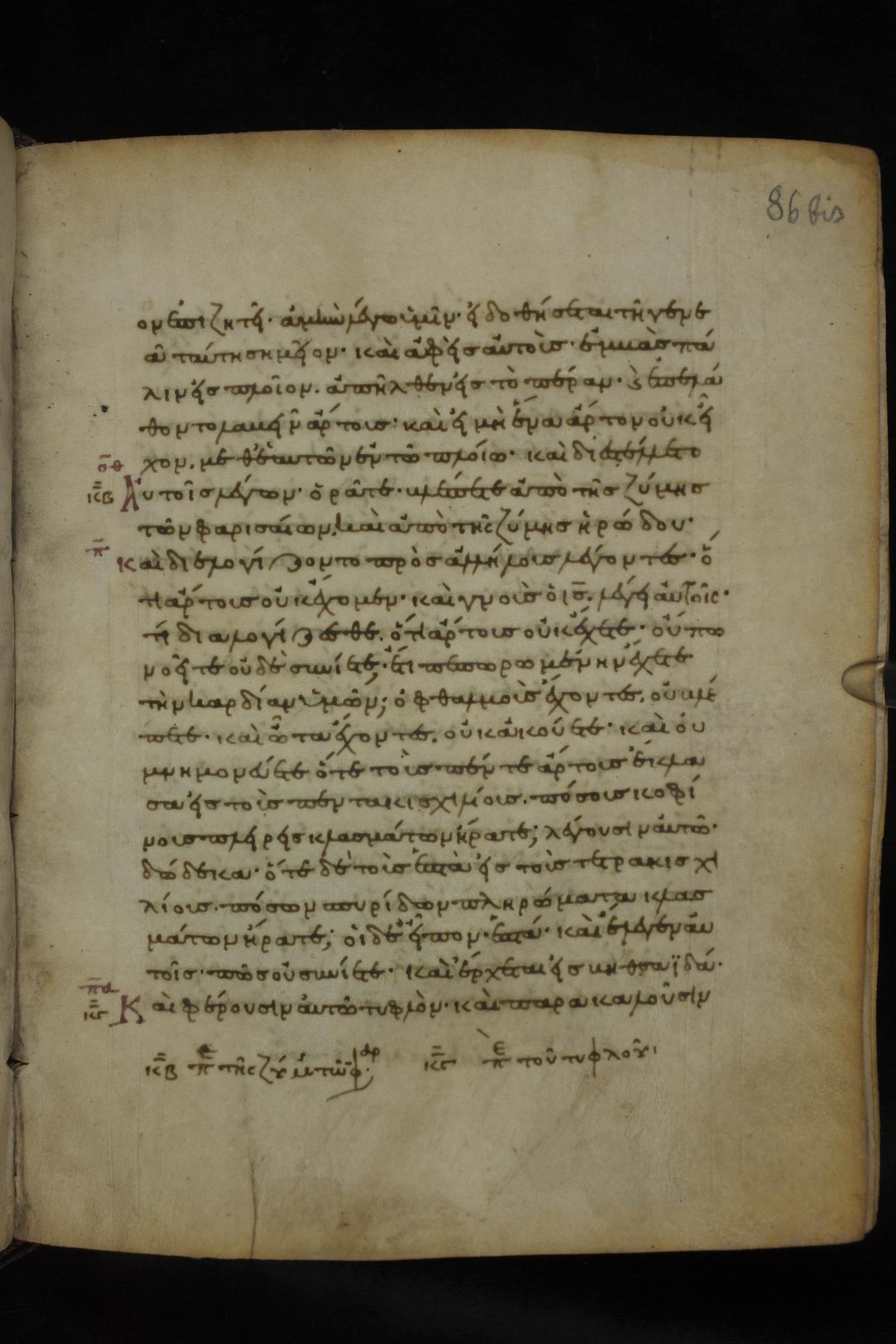 Eleventh or twelfth century minuscule of the Gospels on parchment; 231 leaves, 1 column, 21 lines per column. Images were taken at the National Library of Greece in Athens.