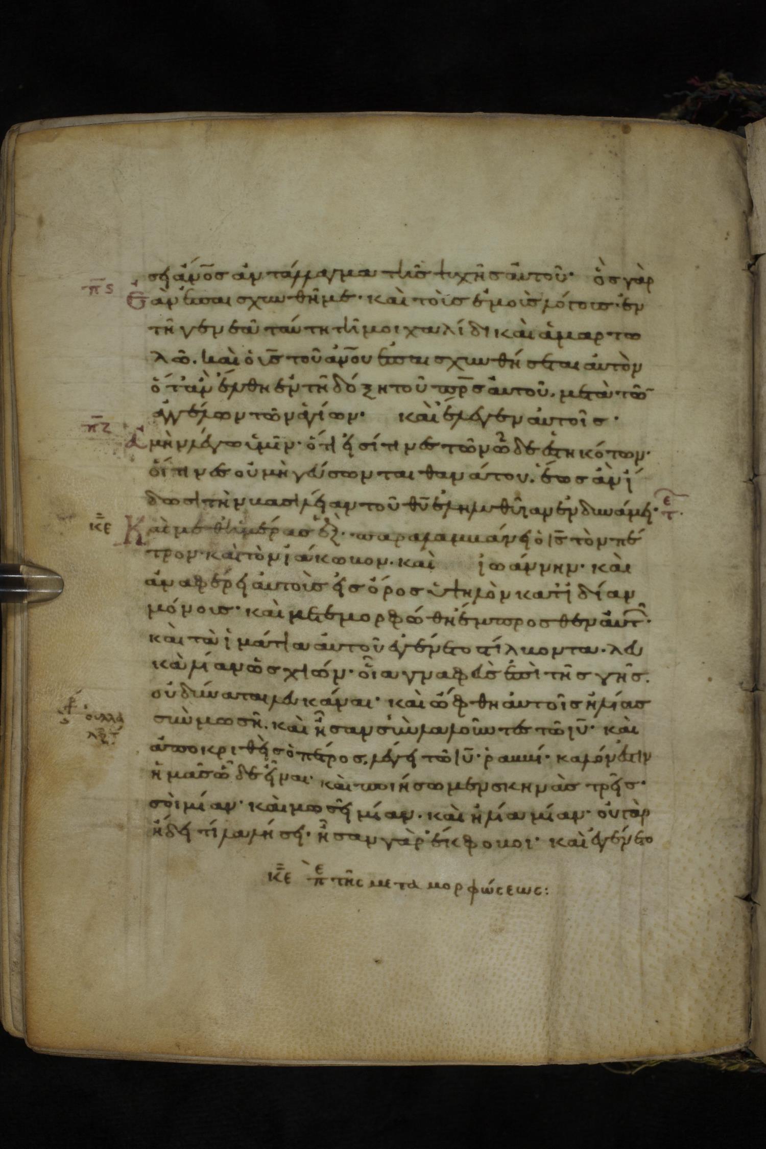 Eleventh or twelfth century minuscule of the Gospels on parchment; 231 leaves, 1 column, 21 lines per column. Images were taken at the National Library of Greece in Athens.