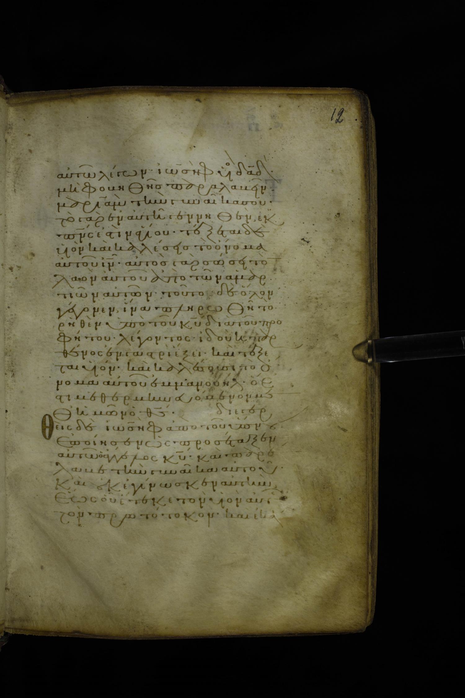 Twelfth century minuscule of the Gospel on parchment; 305 leaves, 1 column, 24 lines per column. Images were taken at the National Library of Greece in Athens.