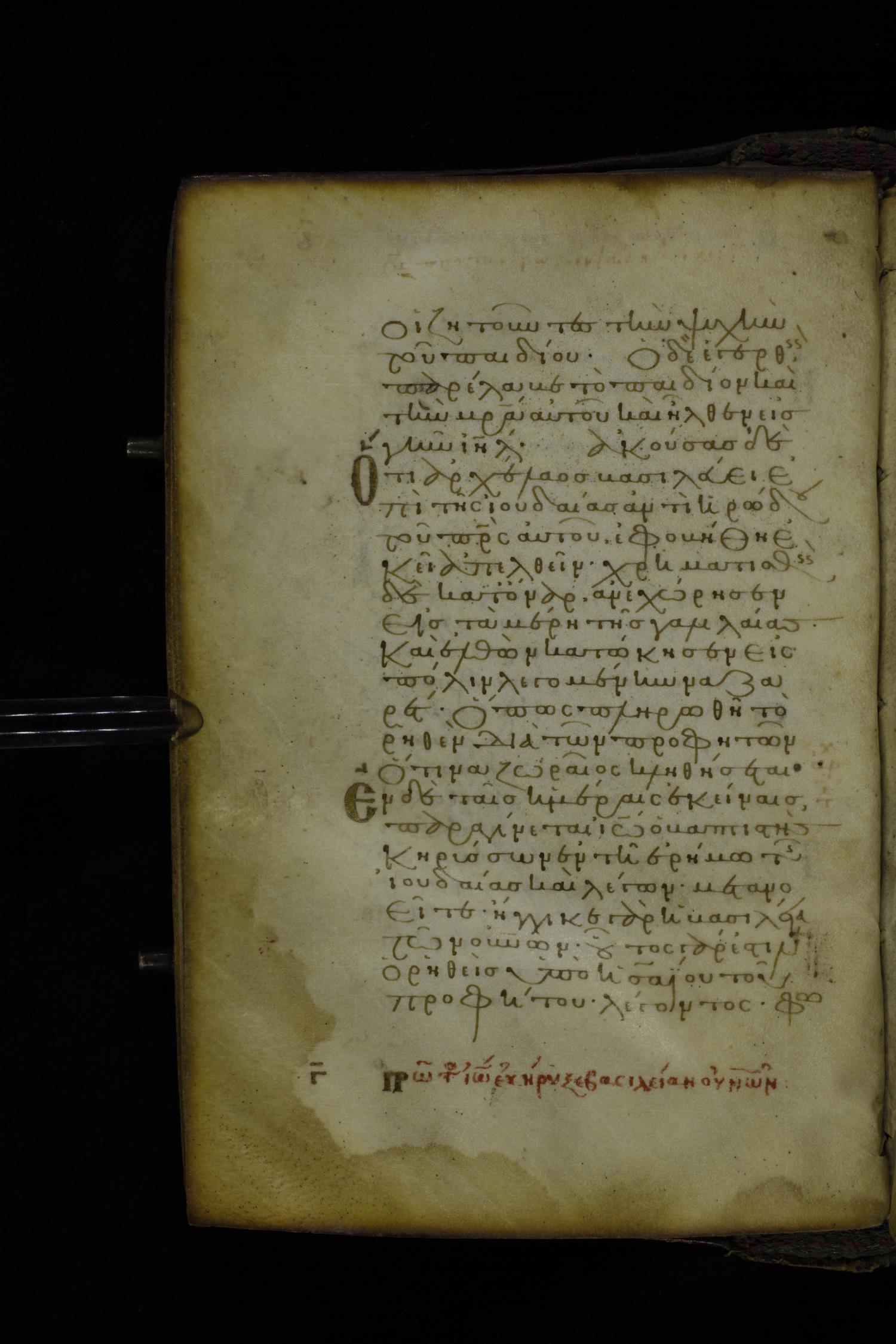 Twelfth century minuscule of the Gospel on parchment; 305 leaves, 1 column, 24 lines per column. Images were taken at the National Library of Greece in Athens.