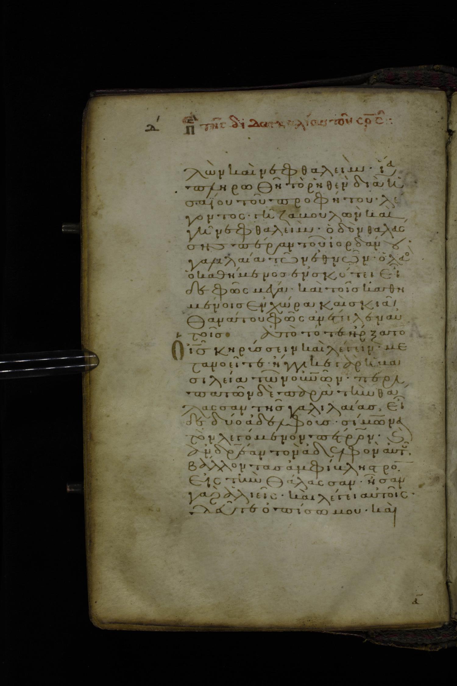 Twelfth century minuscule of the Gospel on parchment; 305 leaves, 1 column, 24 lines per column. Images were taken at the National Library of Greece in Athens.
