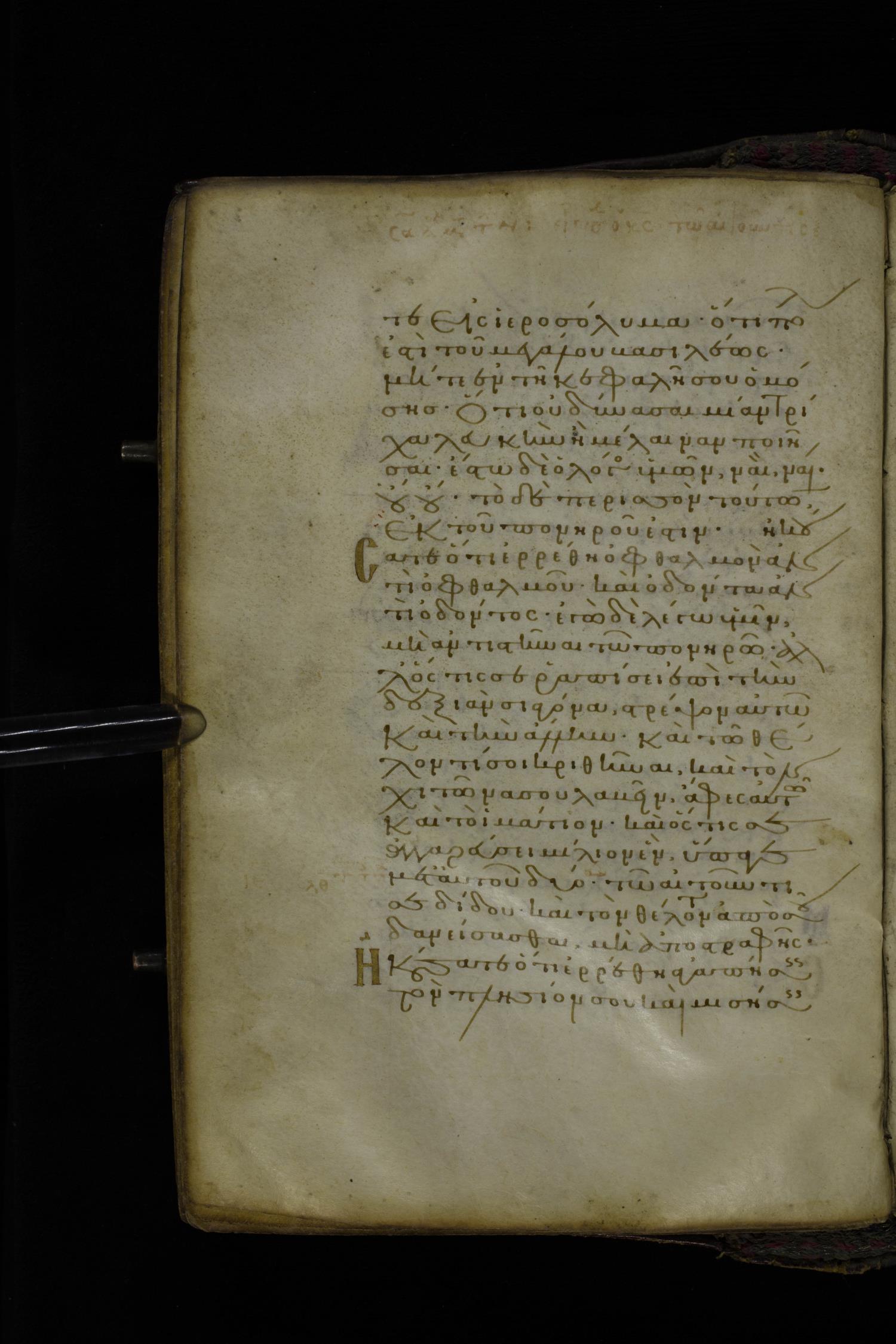 Twelfth century minuscule of the Gospel on parchment; 305 leaves, 1 column, 24 lines per column. Images were taken at the National Library of Greece in Athens.