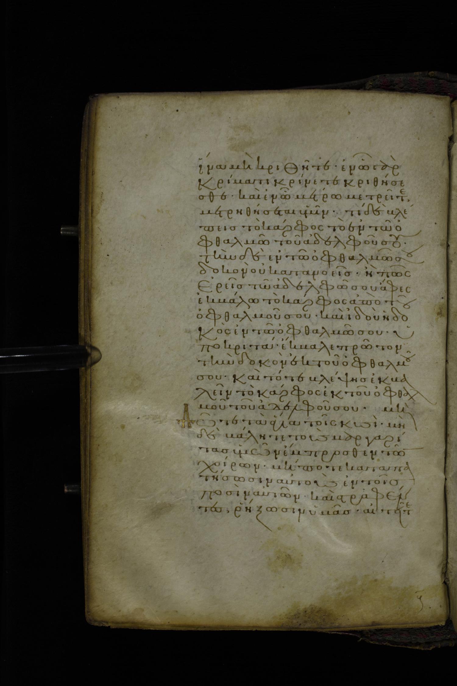 Twelfth century minuscule of the Gospel on parchment; 305 leaves, 1 column, 24 lines per column. Images were taken at the National Library of Greece in Athens.