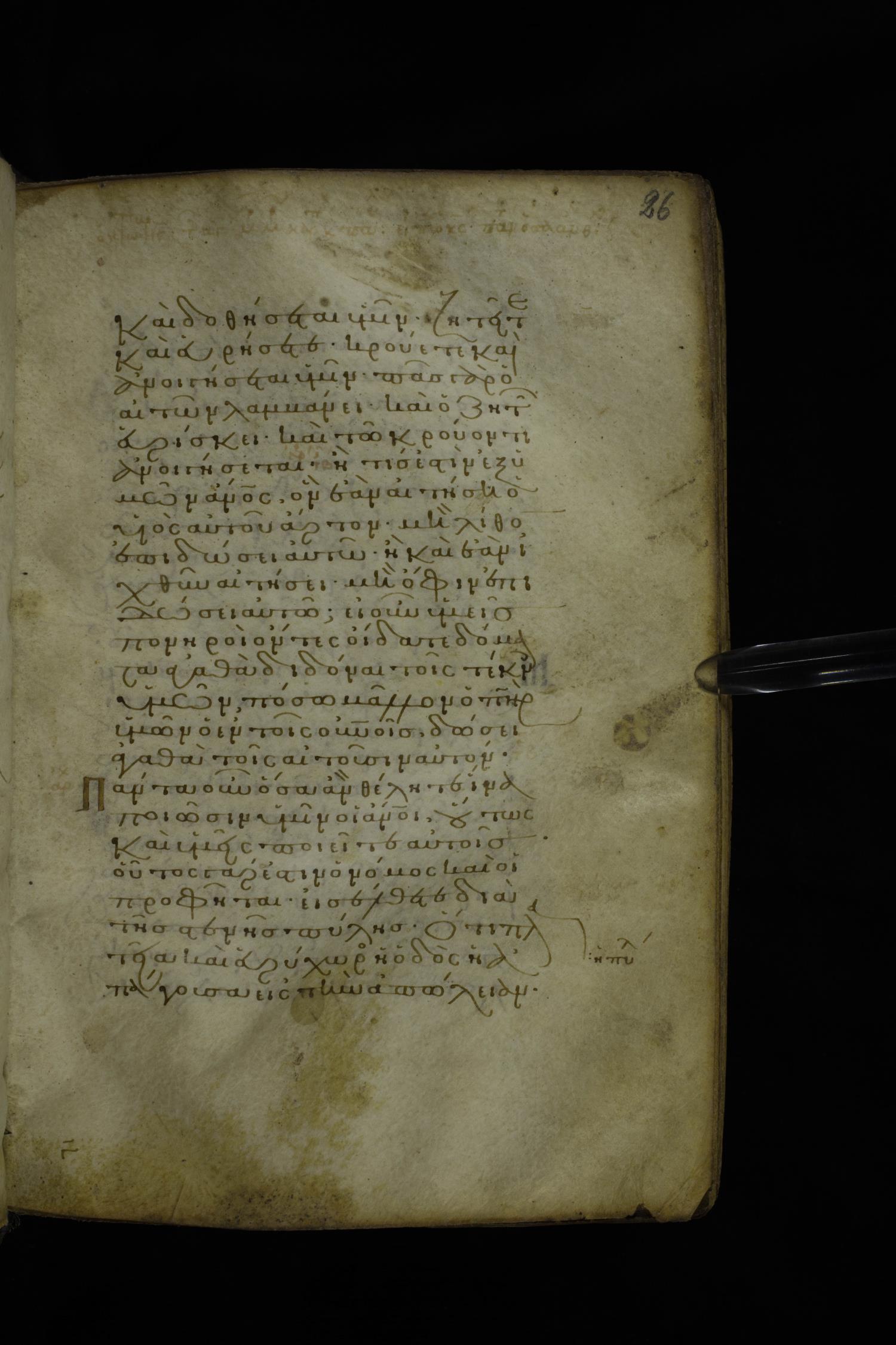 Twelfth century minuscule of the Gospel on parchment; 305 leaves, 1 column, 24 lines per column. Images were taken at the National Library of Greece in Athens.