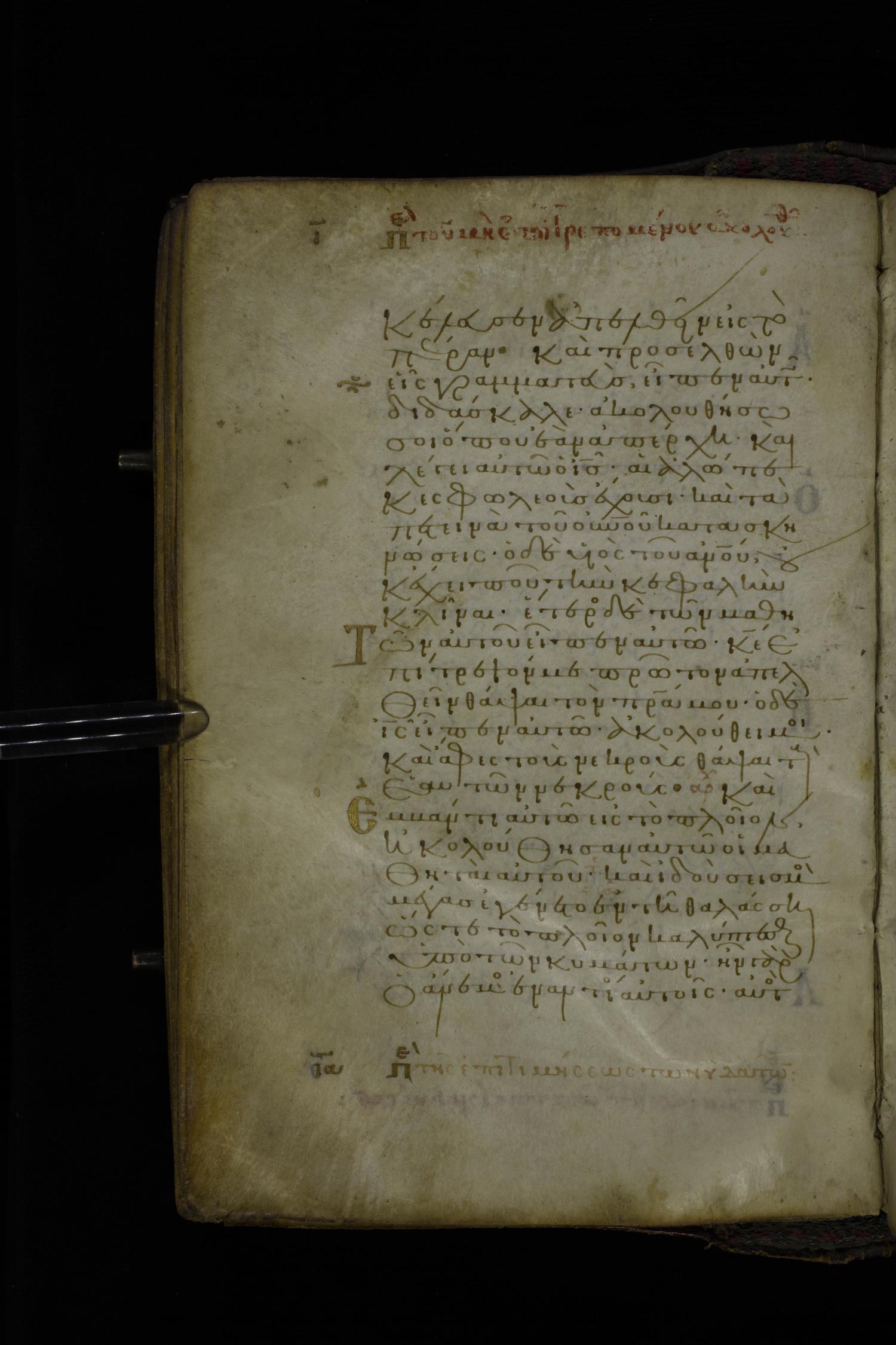 Twelfth century minuscule of the Gospel on parchment; 305 leaves, 1 column, 24 lines per column. Images were taken at the National Library of Greece in Athens.