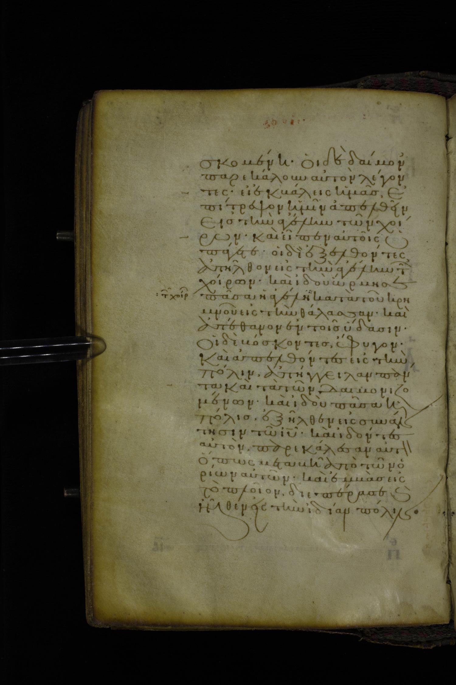 Twelfth century minuscule of the Gospel on parchment; 305 leaves, 1 column, 24 lines per column. Images were taken at the National Library of Greece in Athens.