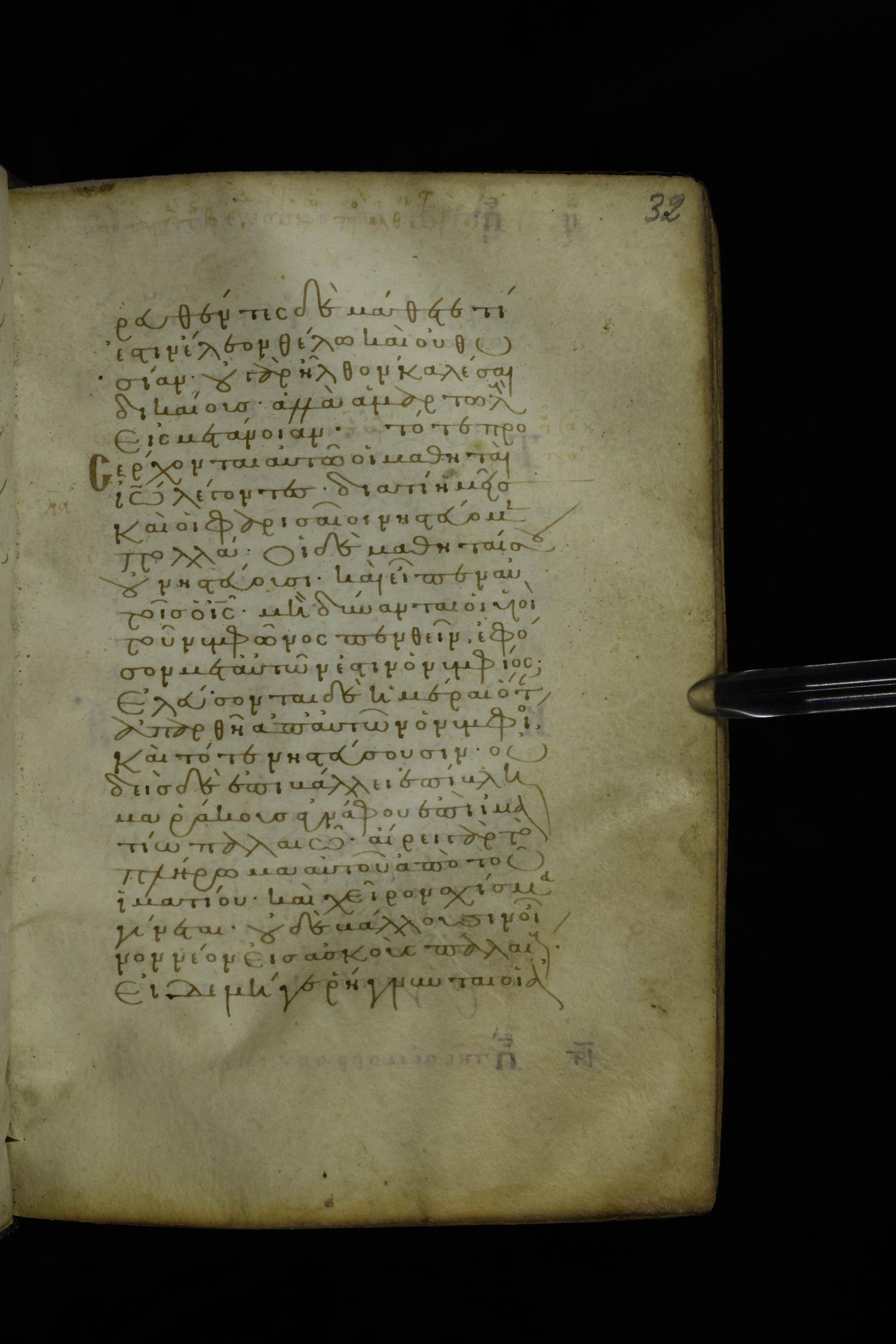 Twelfth century minuscule of the Gospel on parchment; 305 leaves, 1 column, 24 lines per column. Images were taken at the National Library of Greece in Athens.