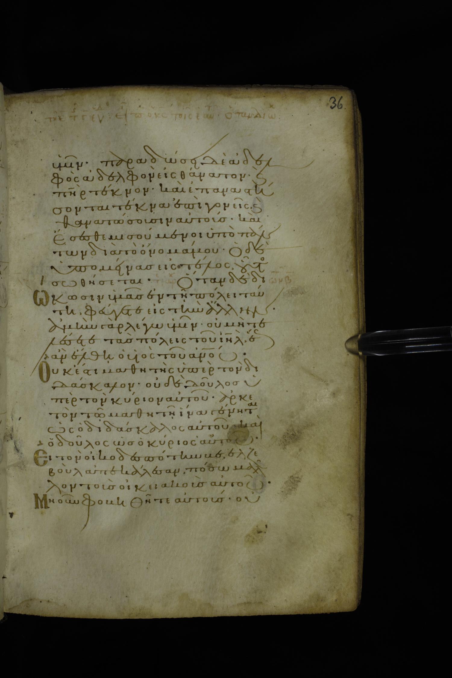 Twelfth century minuscule of the Gospel on parchment; 305 leaves, 1 column, 24 lines per column. Images were taken at the National Library of Greece in Athens.