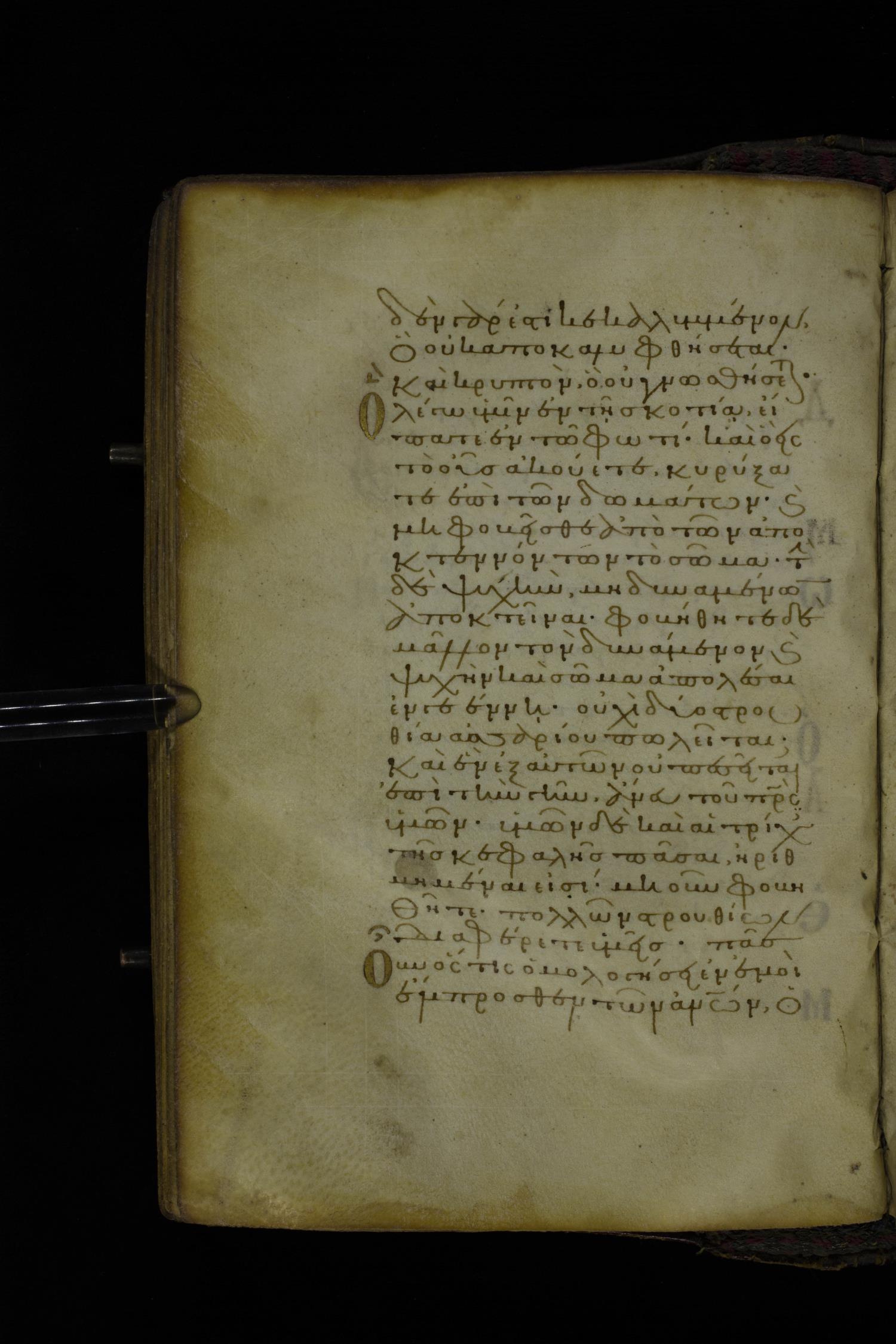 Twelfth century minuscule of the Gospel on parchment; 305 leaves, 1 column, 24 lines per column. Images were taken at the National Library of Greece in Athens.