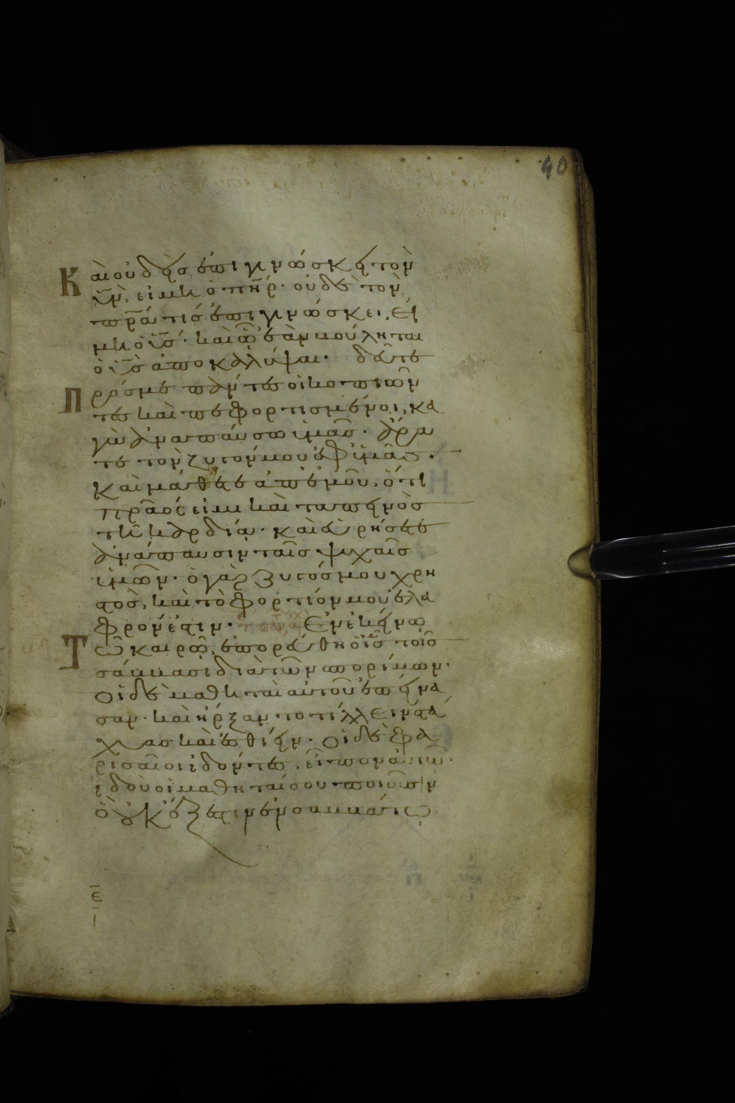 Twelfth century minuscule of the Gospel on parchment; 305 leaves, 1 column, 24 lines per column. Images were taken at the National Library of Greece in Athens.