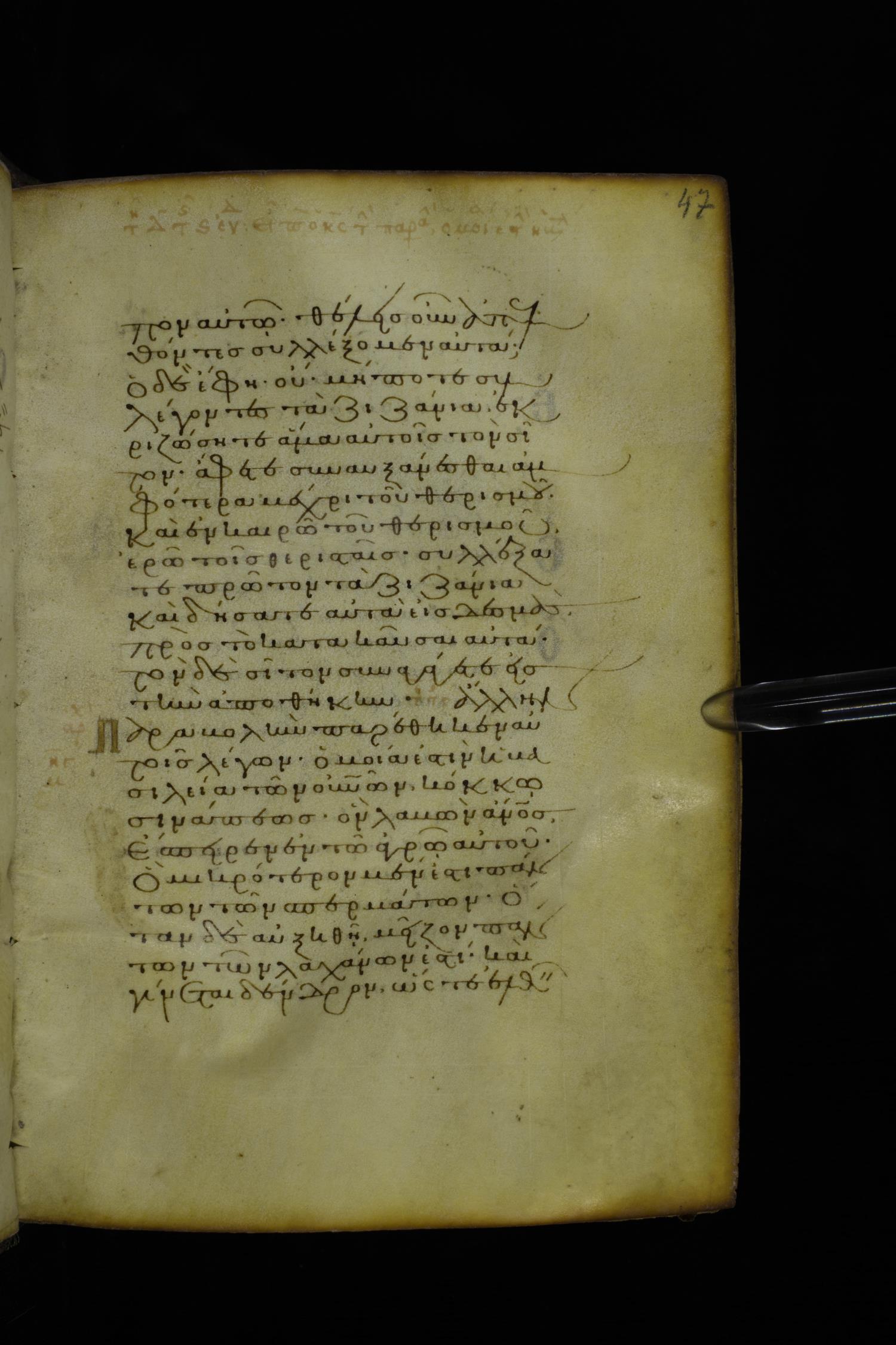 Twelfth century minuscule of the Gospel on parchment; 305 leaves, 1 column, 24 lines per column. Images were taken at the National Library of Greece in Athens.