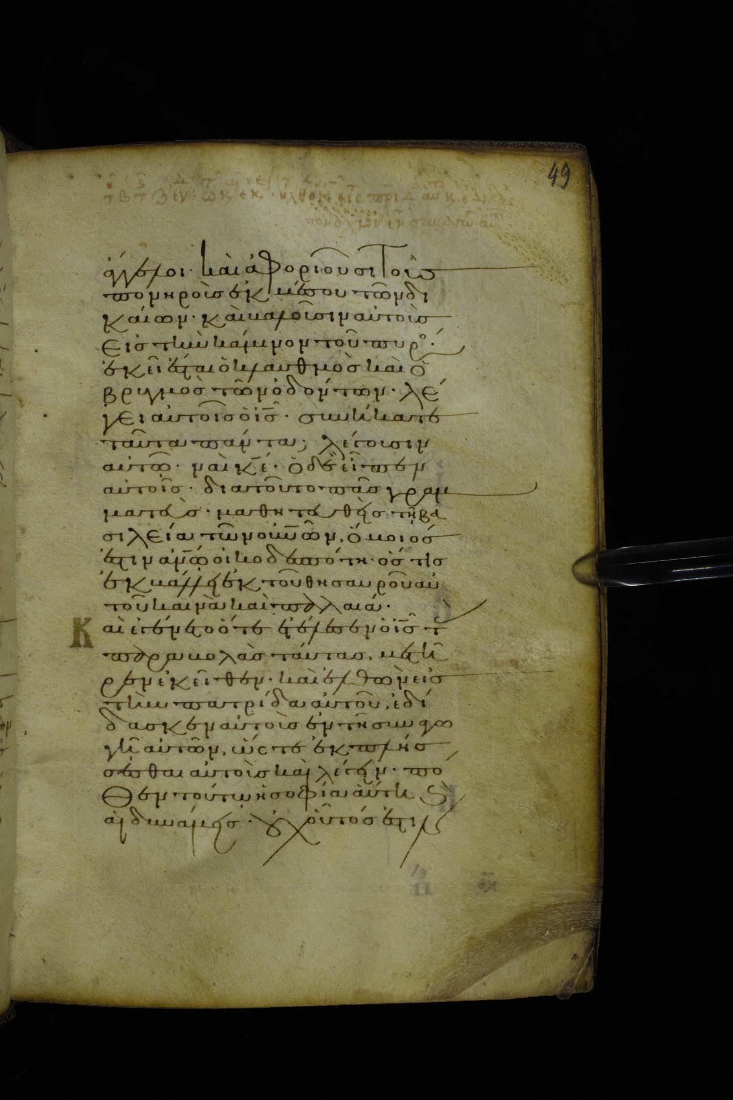Twelfth century minuscule of the Gospel on parchment; 305 leaves, 1 column, 24 lines per column. Images were taken at the National Library of Greece in Athens.