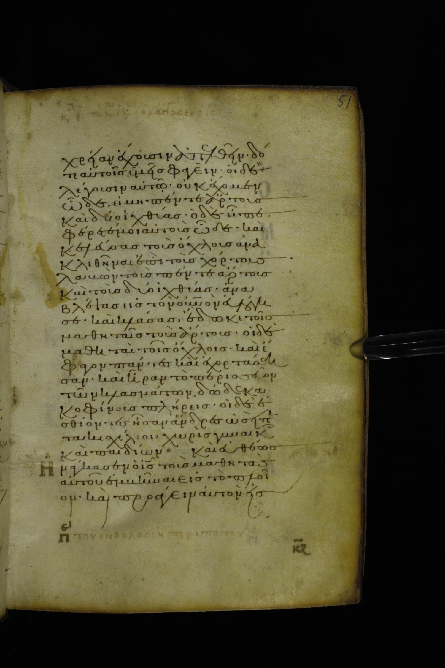 Twelfth century minuscule of the Gospel on parchment; 305 leaves, 1 column, 24 lines per column. Images were taken at the National Library of Greece in Athens.