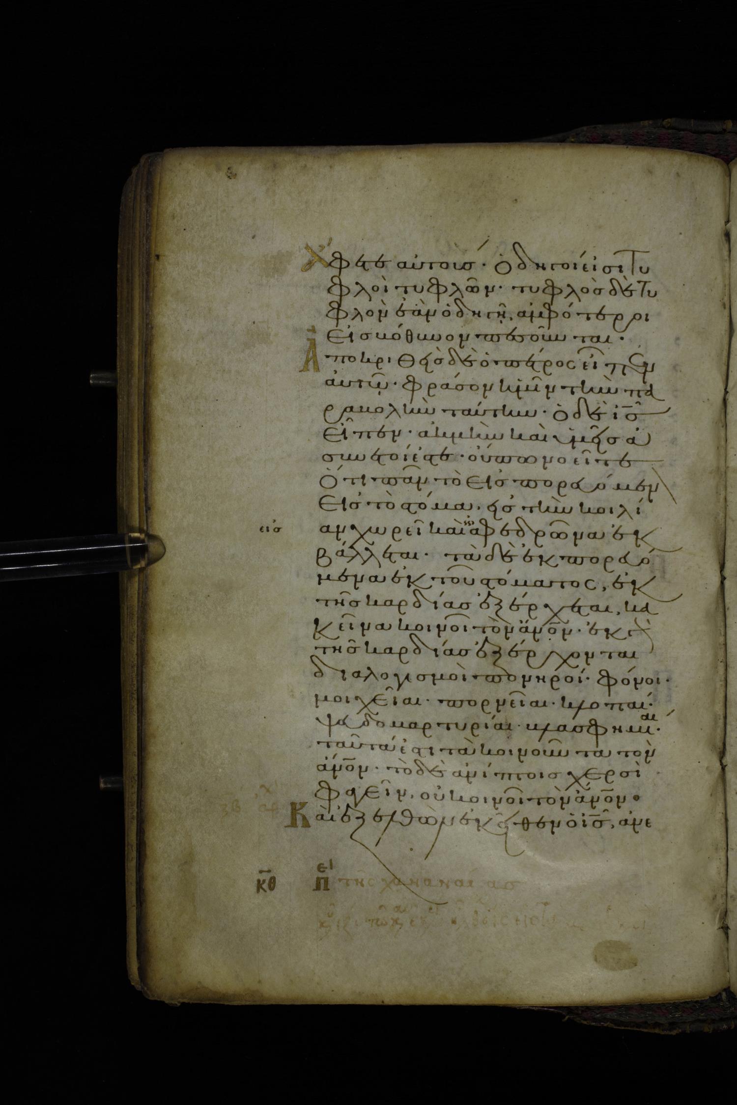 Twelfth century minuscule of the Gospel on parchment; 305 leaves, 1 column, 24 lines per column. Images were taken at the National Library of Greece in Athens.