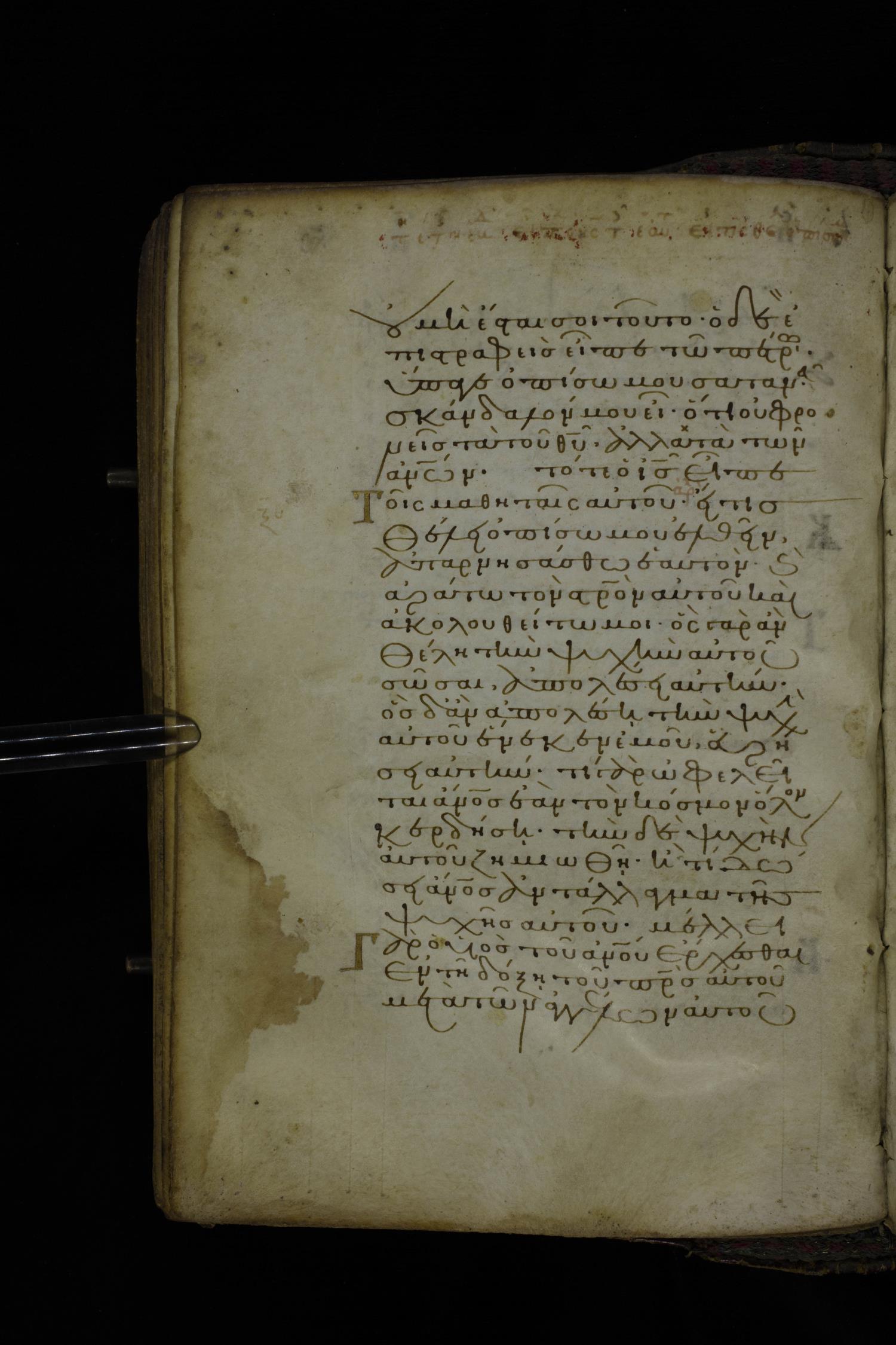 Twelfth century minuscule of the Gospel on parchment; 305 leaves, 1 column, 24 lines per column. Images were taken at the National Library of Greece in Athens.