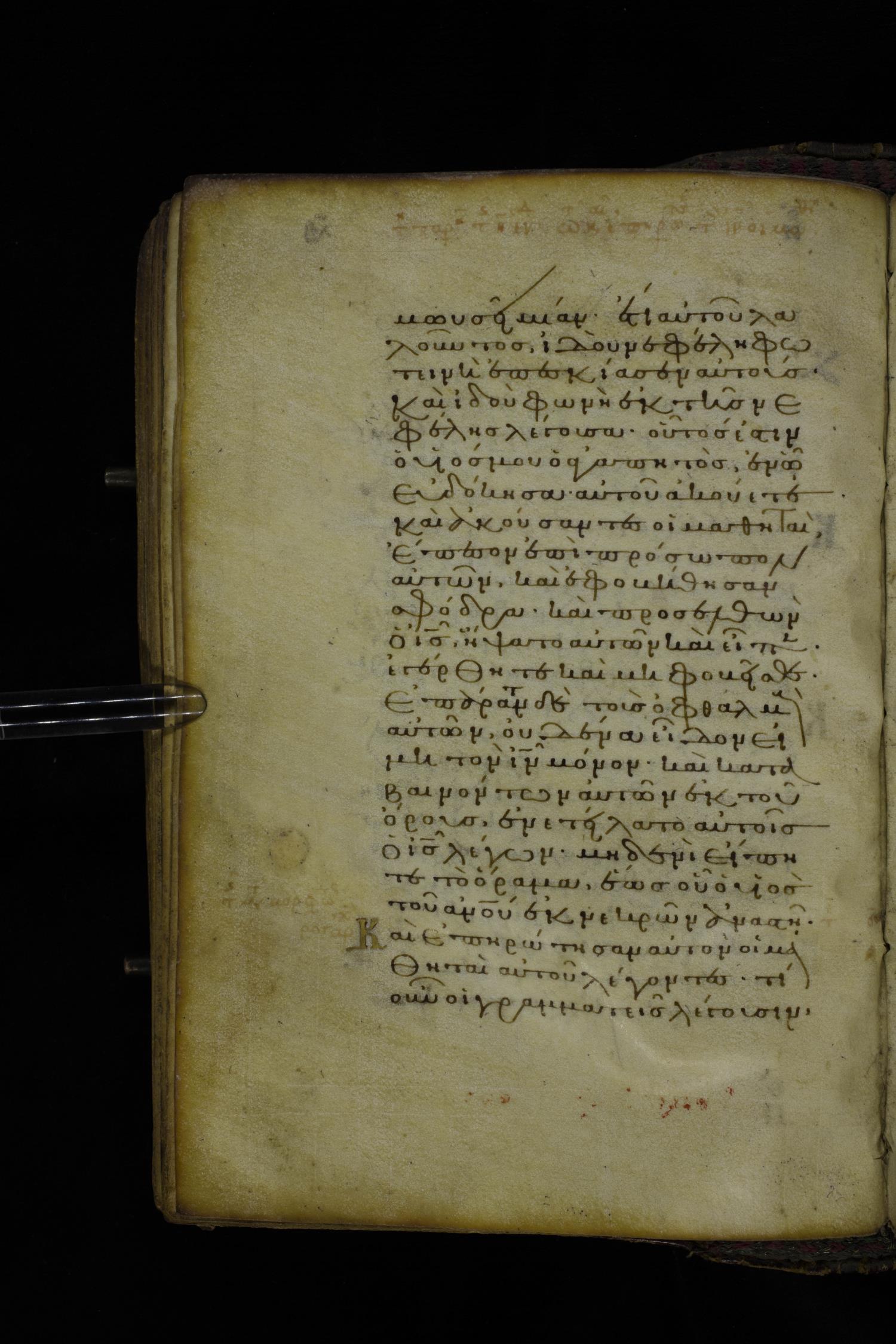 Twelfth century minuscule of the Gospel on parchment; 305 leaves, 1 column, 24 lines per column. Images were taken at the National Library of Greece in Athens.