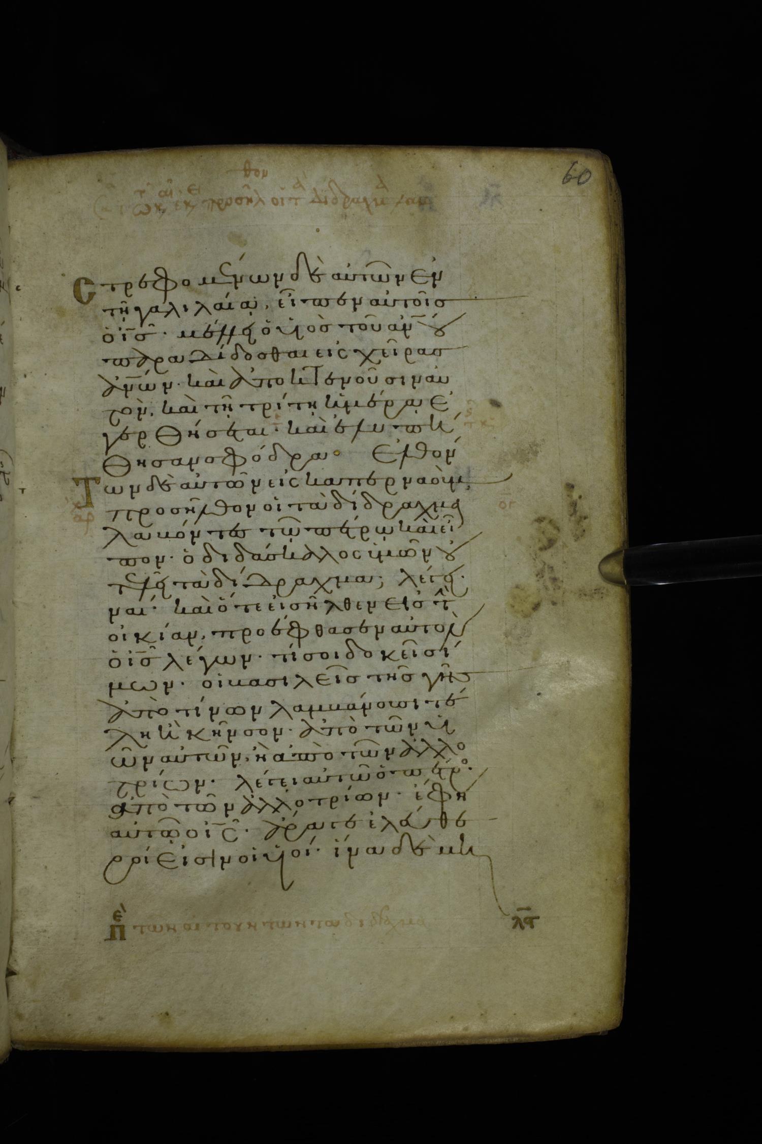 Twelfth century minuscule of the Gospel on parchment; 305 leaves, 1 column, 24 lines per column. Images were taken at the National Library of Greece in Athens.