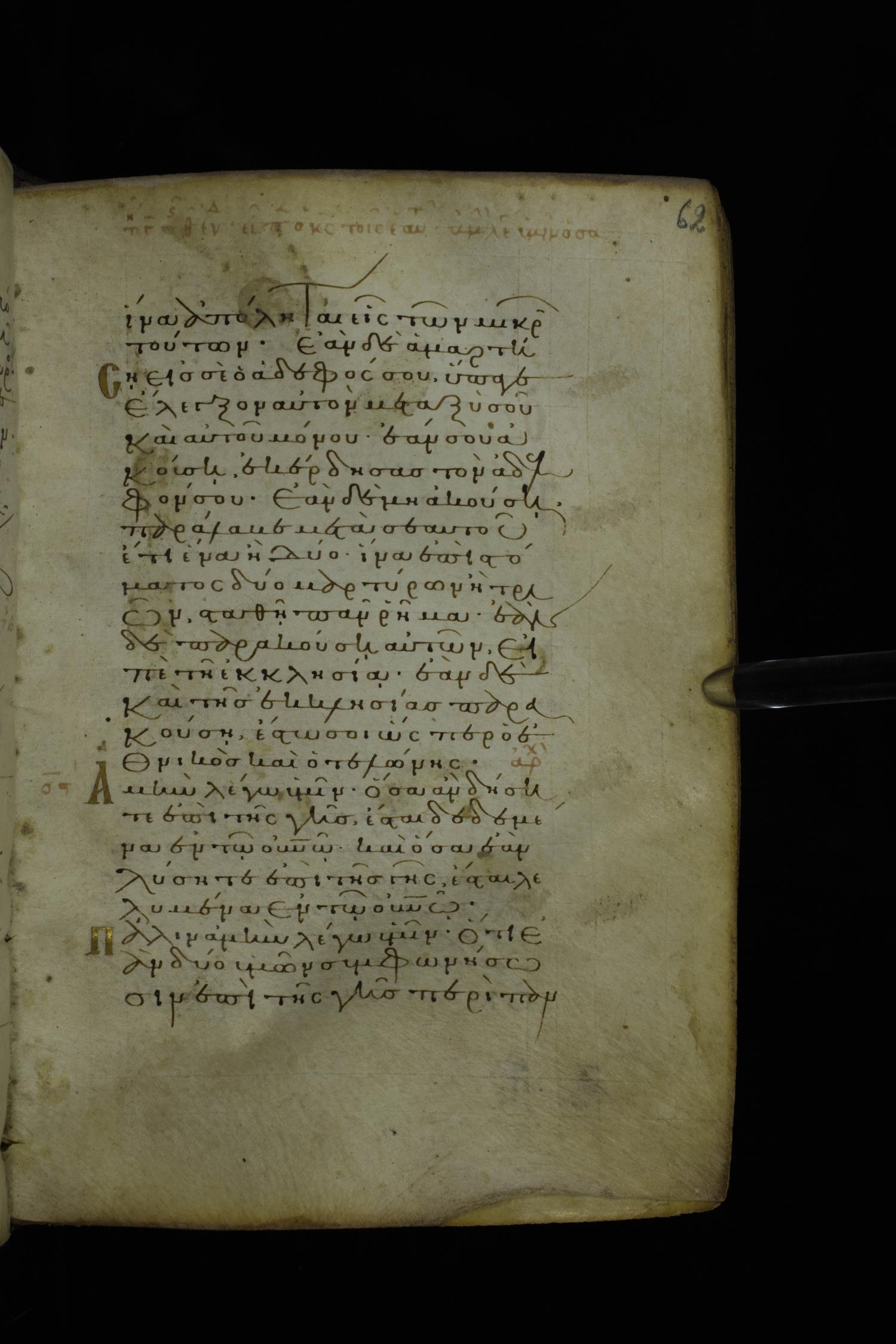 Twelfth century minuscule of the Gospel on parchment; 305 leaves, 1 column, 24 lines per column. Images were taken at the National Library of Greece in Athens.
