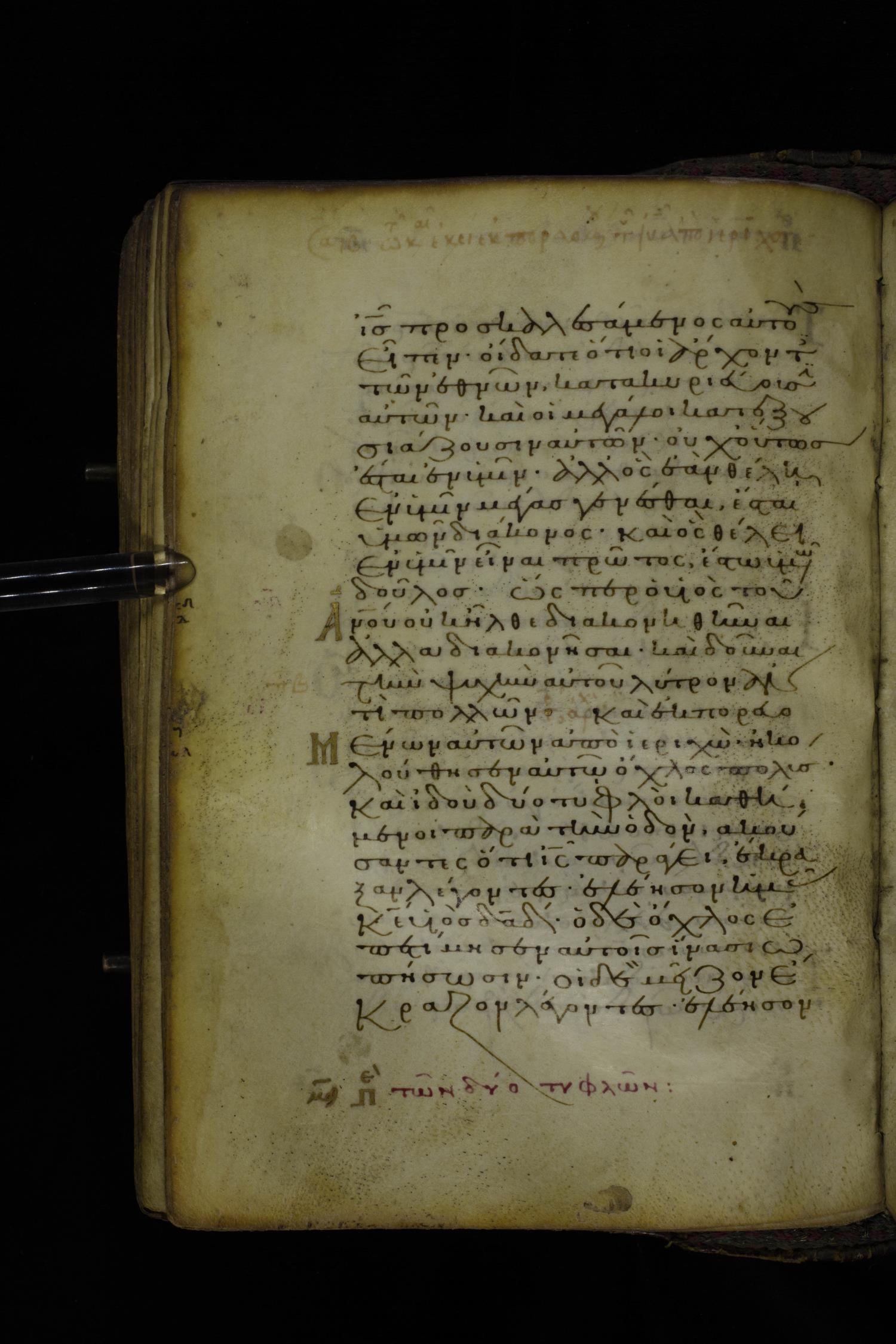 Twelfth century minuscule of the Gospel on parchment; 305 leaves, 1 column, 24 lines per column. Images were taken at the National Library of Greece in Athens.