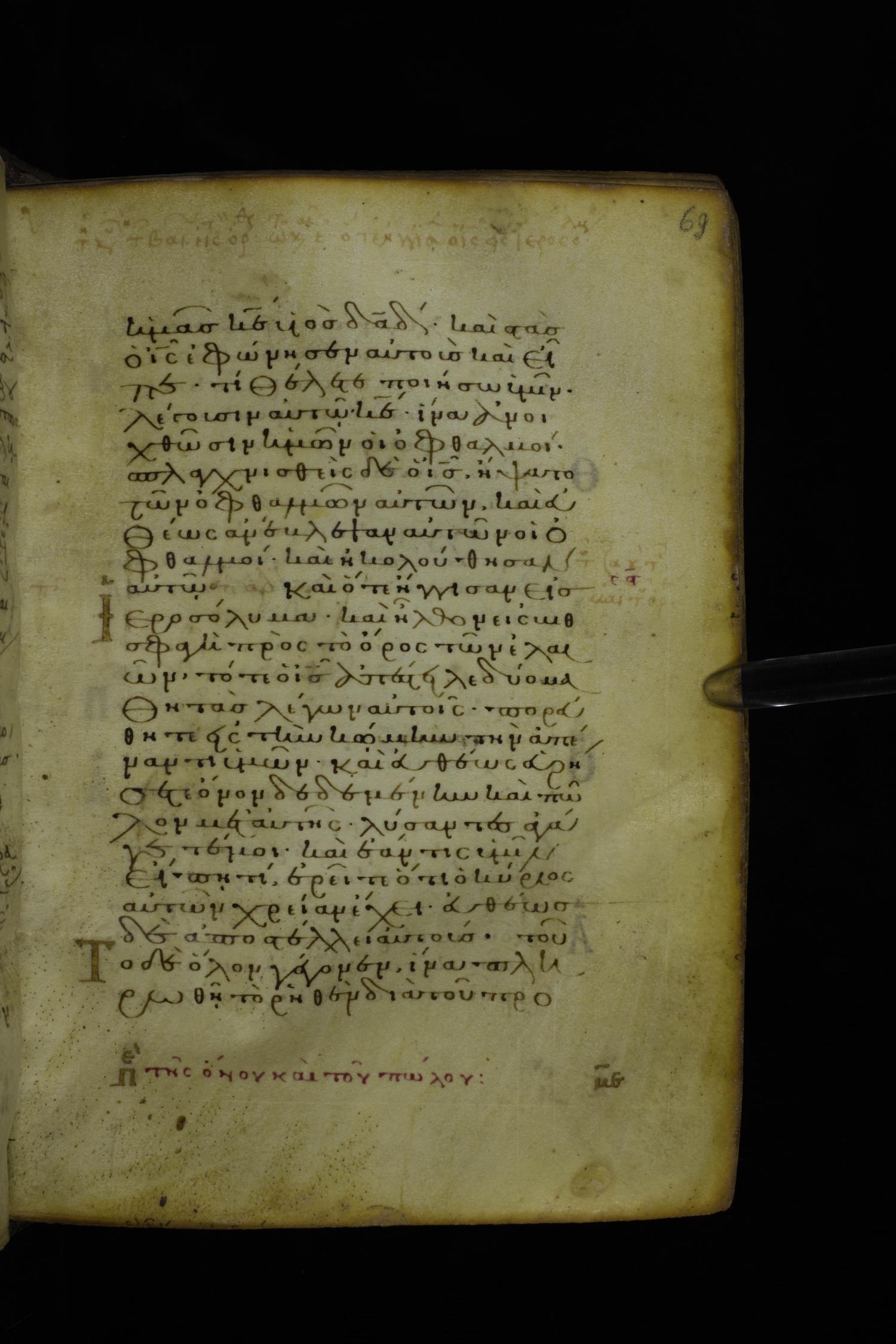 Twelfth century minuscule of the Gospel on parchment; 305 leaves, 1 column, 24 lines per column. Images were taken at the National Library of Greece in Athens.