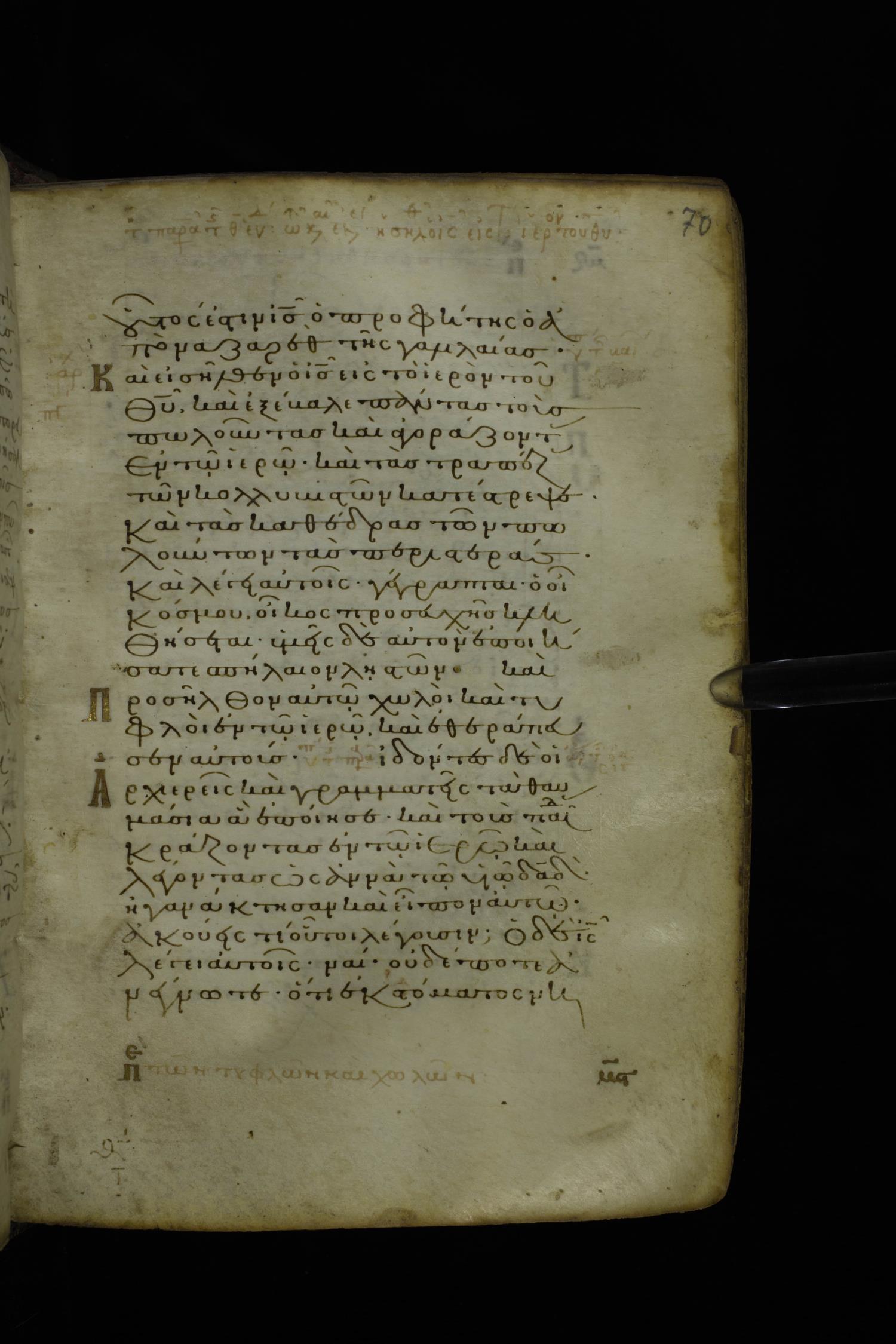Twelfth century minuscule of the Gospel on parchment; 305 leaves, 1 column, 24 lines per column. Images were taken at the National Library of Greece in Athens.