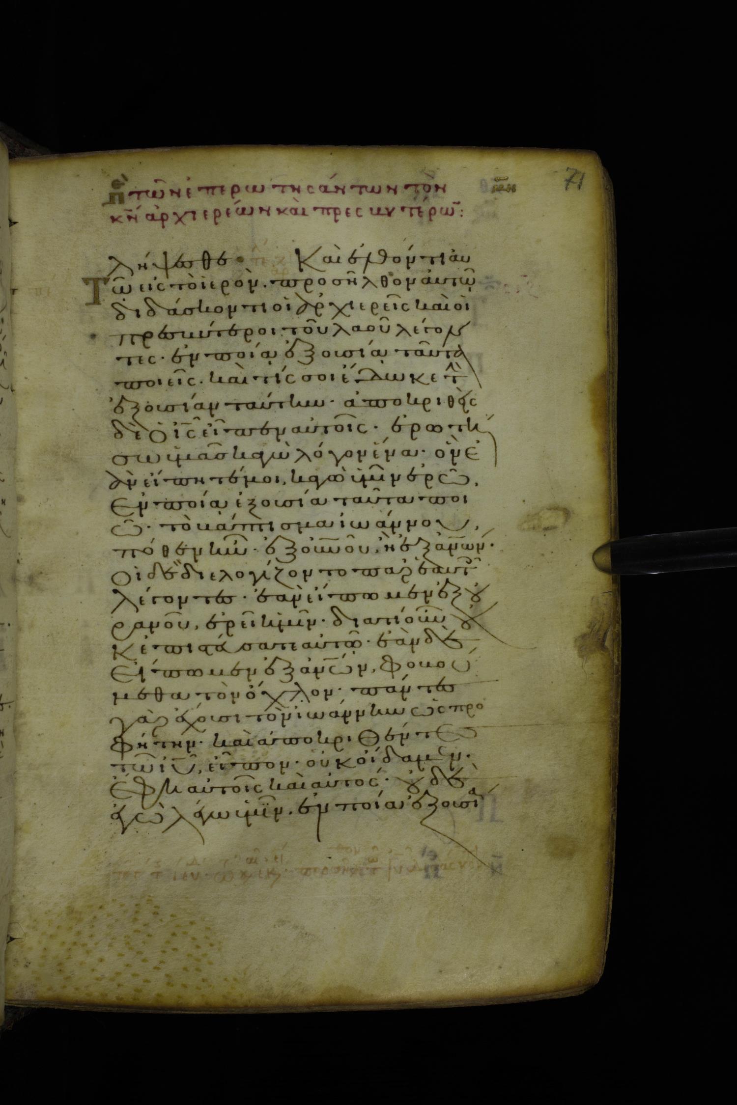Twelfth century minuscule of the Gospel on parchment; 305 leaves, 1 column, 24 lines per column. Images were taken at the National Library of Greece in Athens.