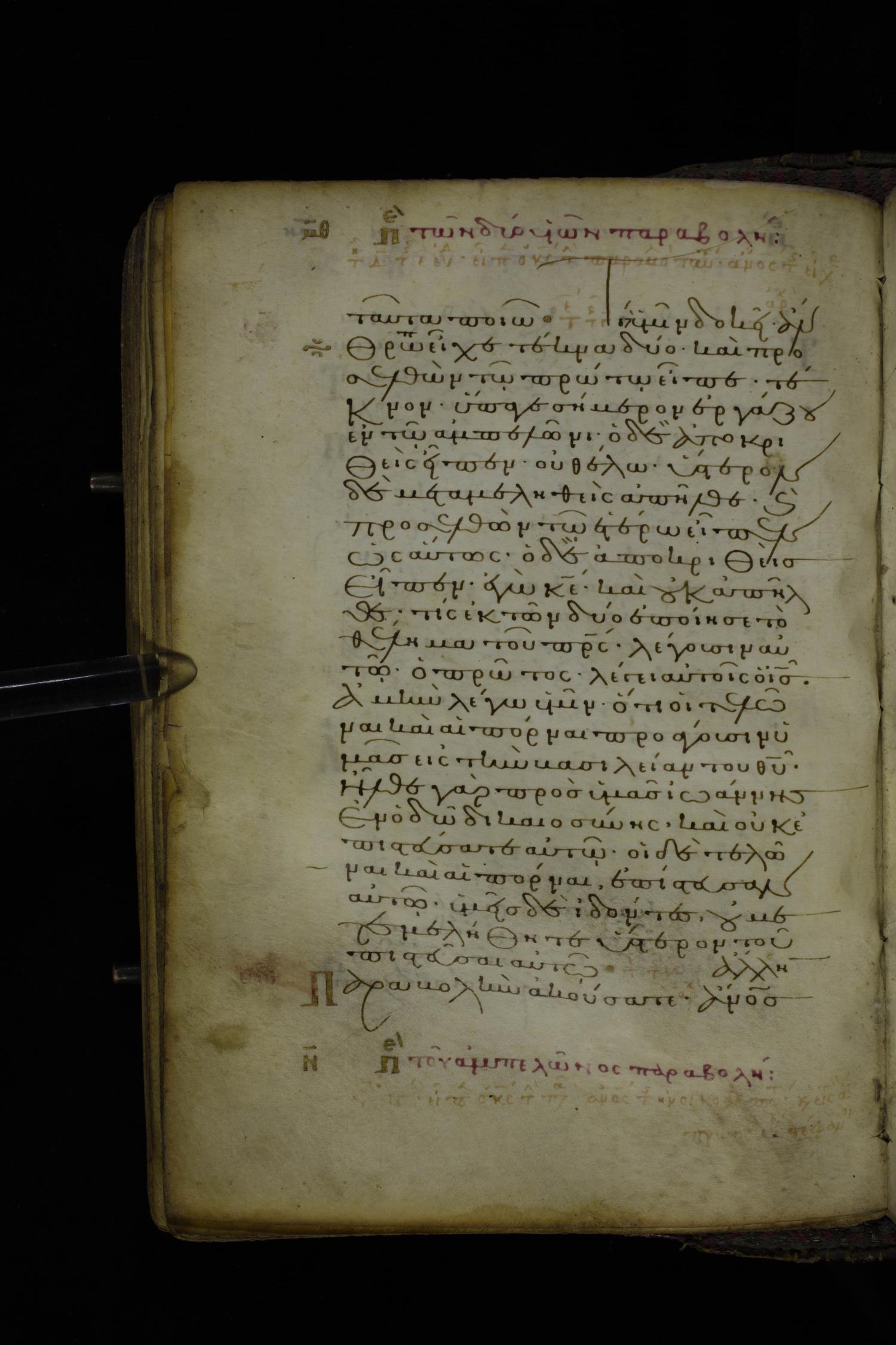 Twelfth century minuscule of the Gospel on parchment; 305 leaves, 1 column, 24 lines per column. Images were taken at the National Library of Greece in Athens.