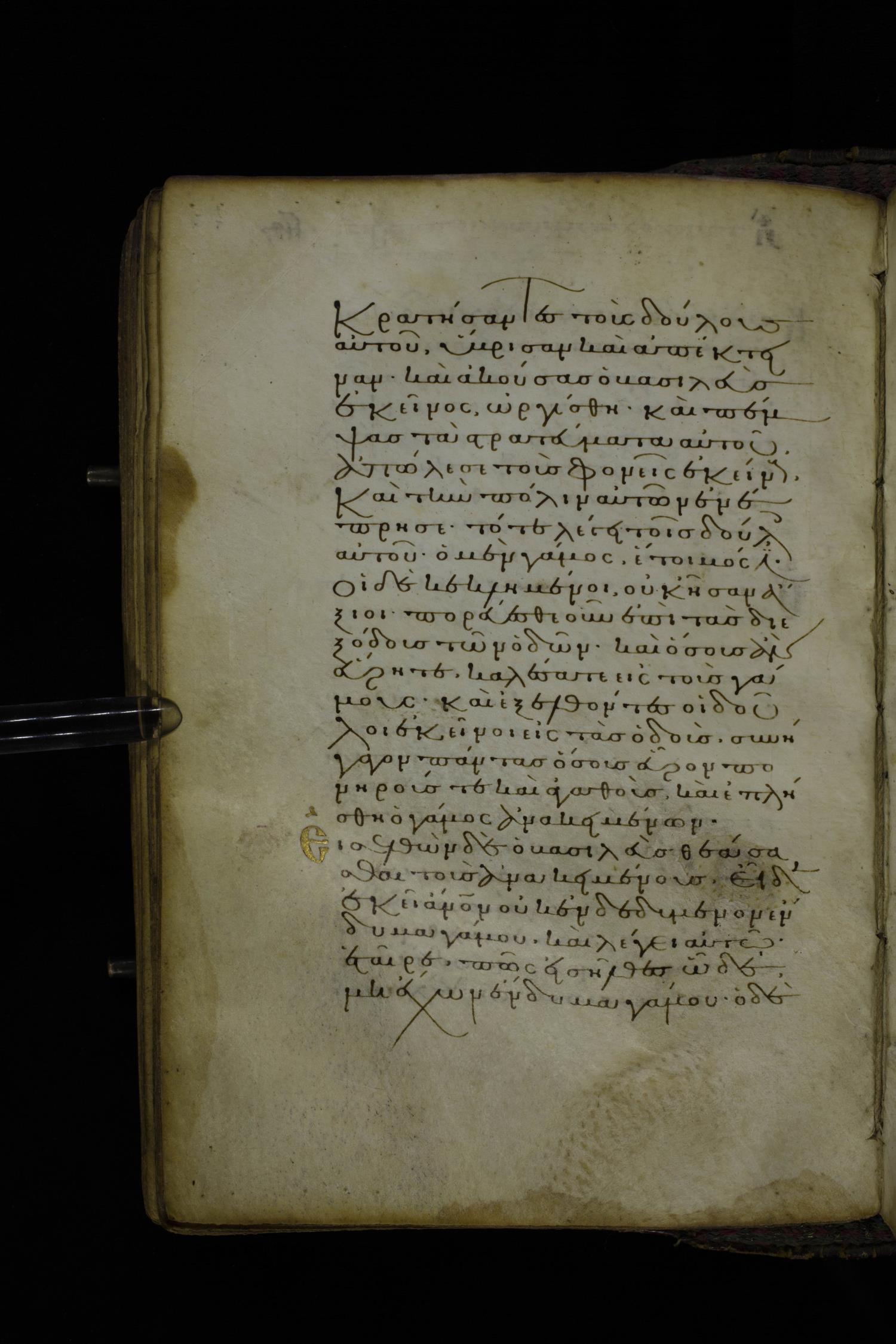 Twelfth century minuscule of the Gospel on parchment; 305 leaves, 1 column, 24 lines per column. Images were taken at the National Library of Greece in Athens.