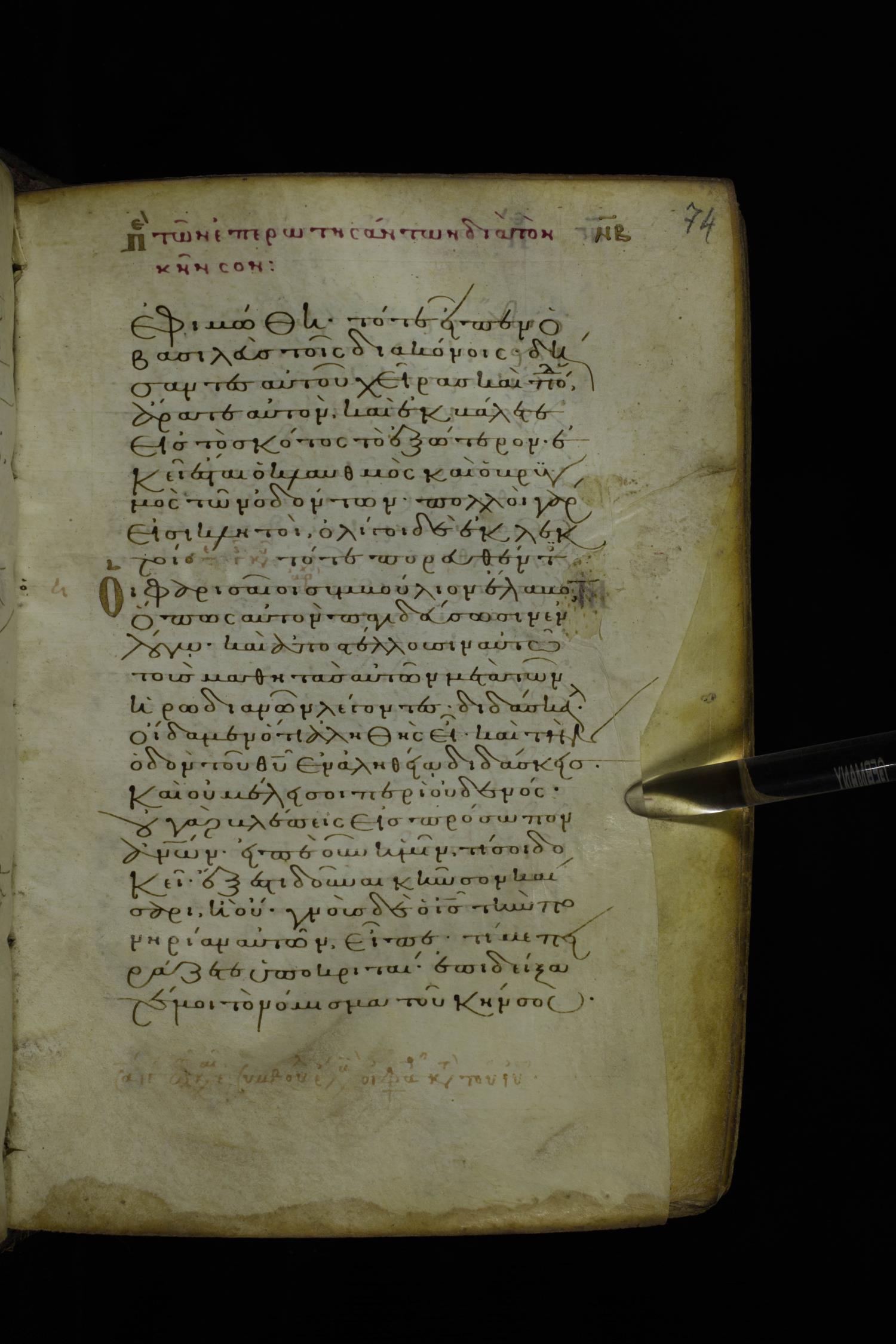 Twelfth century minuscule of the Gospel on parchment; 305 leaves, 1 column, 24 lines per column. Images were taken at the National Library of Greece in Athens.