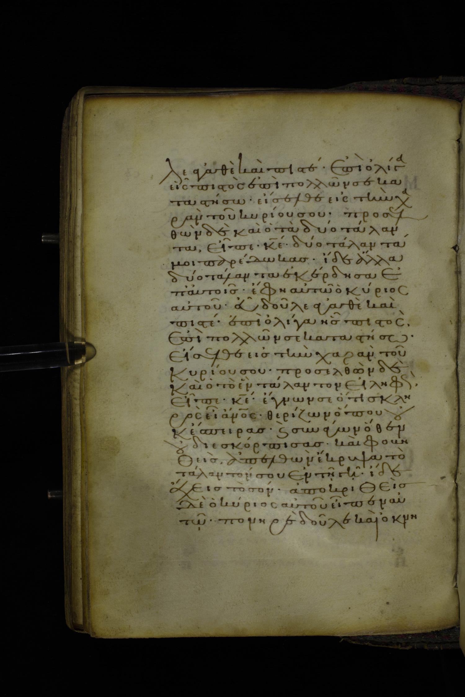 Twelfth century minuscule of the Gospel on parchment; 305 leaves, 1 column, 24 lines per column. Images were taken at the National Library of Greece in Athens.