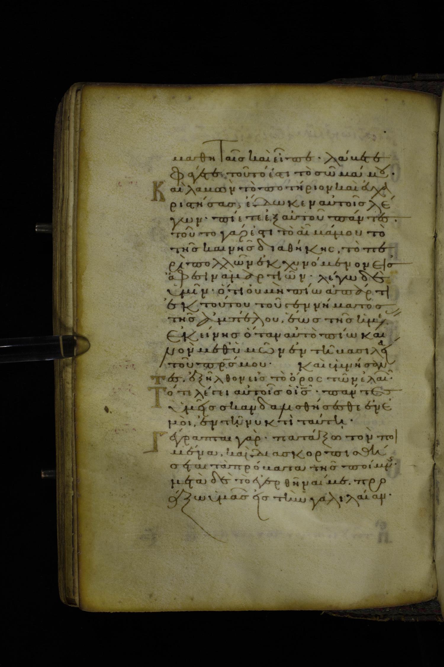 Twelfth century minuscule of the Gospel on parchment; 305 leaves, 1 column, 24 lines per column. Images were taken at the National Library of Greece in Athens.