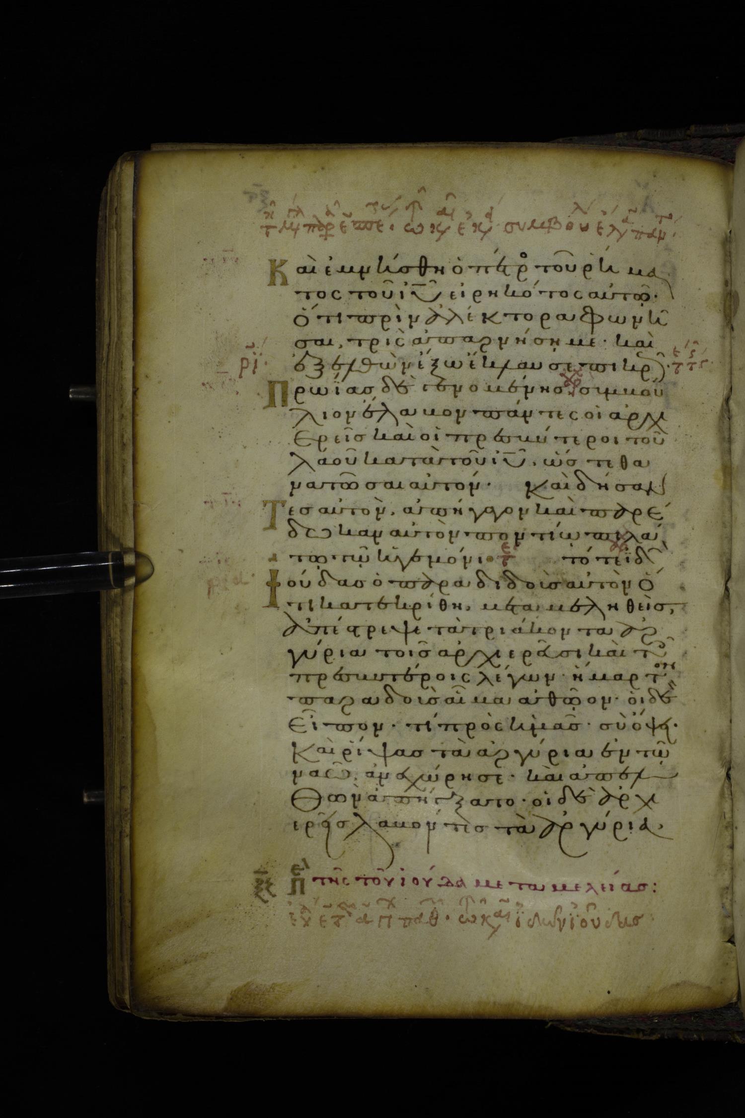 Twelfth century minuscule of the Gospel on parchment; 305 leaves, 1 column, 24 lines per column. Images were taken at the National Library of Greece in Athens.