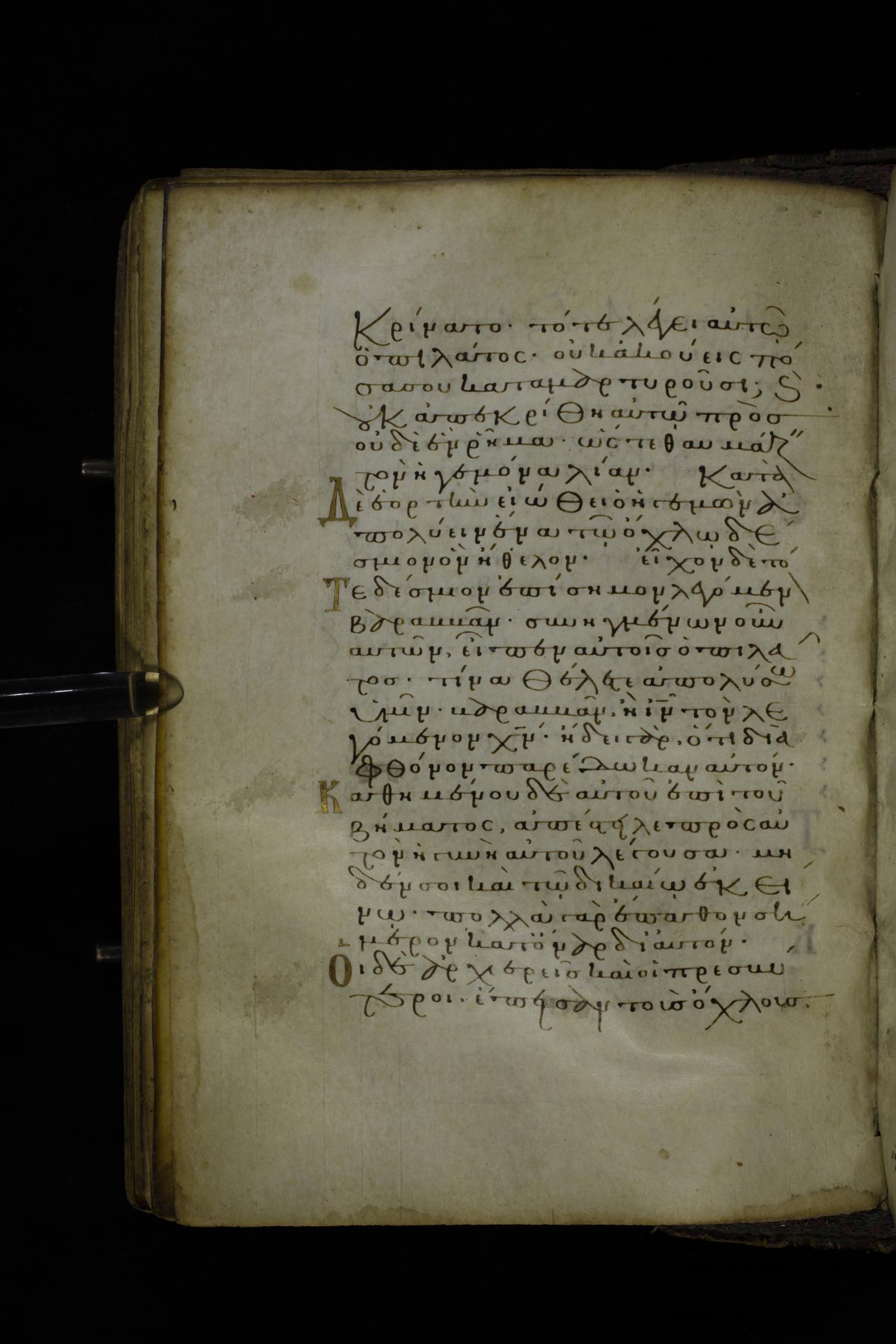 Twelfth century minuscule of the Gospel on parchment; 305 leaves, 1 column, 24 lines per column. Images were taken at the National Library of Greece in Athens.