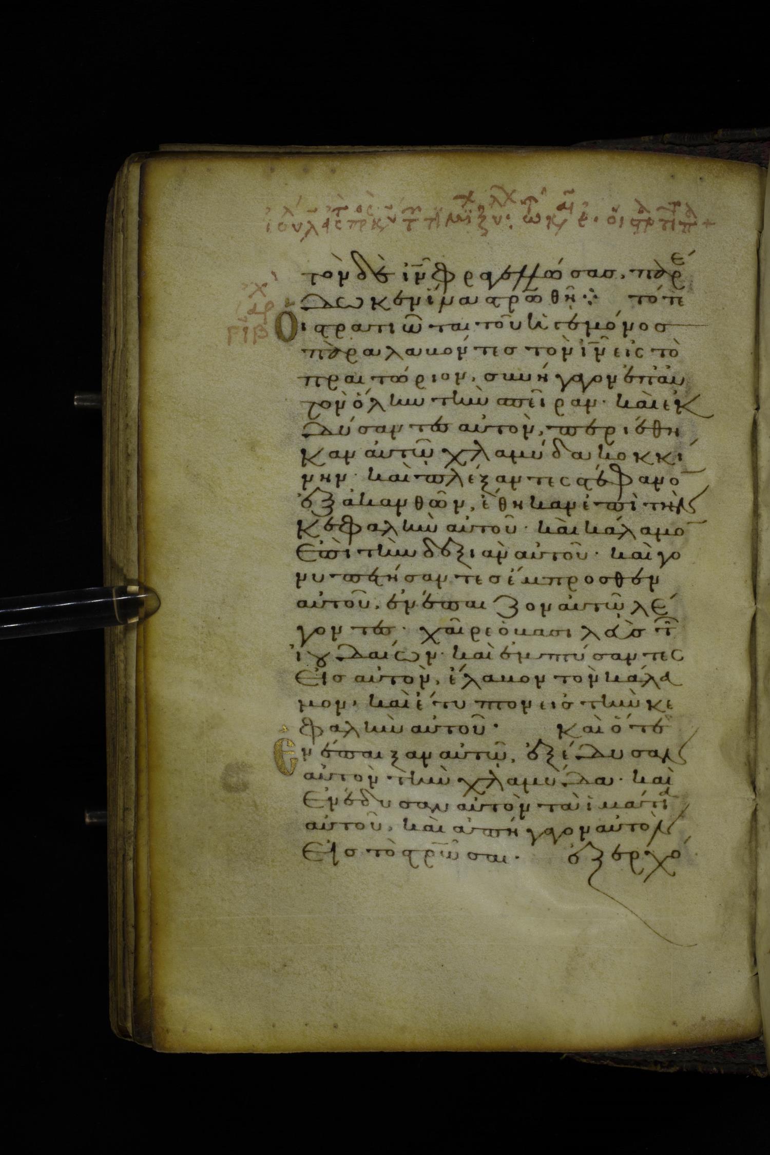 Twelfth century minuscule of the Gospel on parchment; 305 leaves, 1 column, 24 lines per column. Images were taken at the National Library of Greece in Athens.