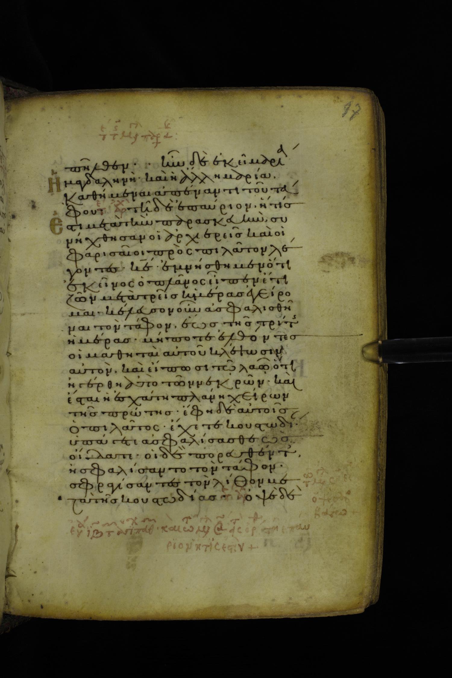 Twelfth century minuscule of the Gospel on parchment; 305 leaves, 1 column, 24 lines per column. Images were taken at the National Library of Greece in Athens.