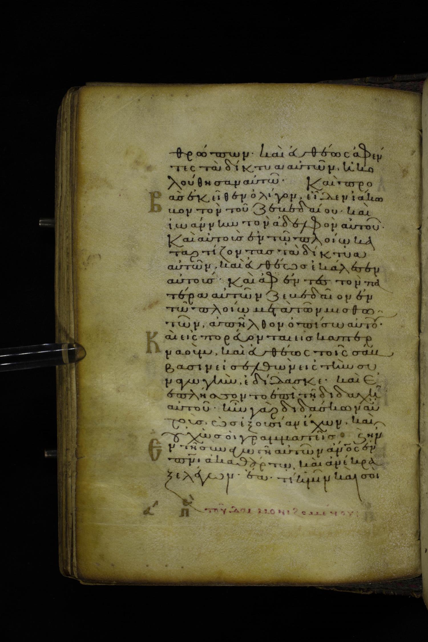 Twelfth century minuscule of the Gospel on parchment; 305 leaves, 1 column, 24 lines per column. Images were taken at the National Library of Greece in Athens.