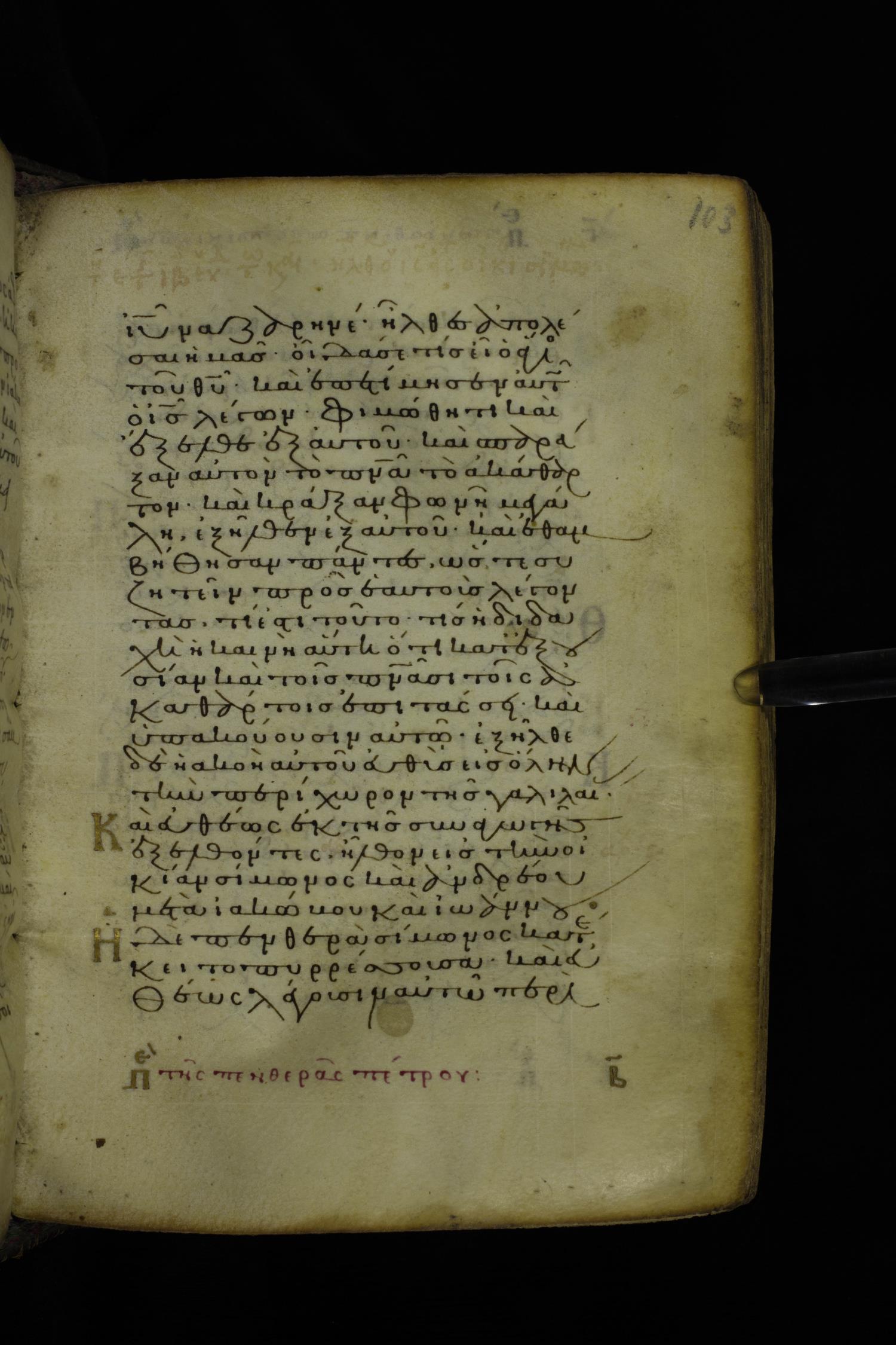 Twelfth century minuscule of the Gospel on parchment; 305 leaves, 1 column, 24 lines per column. Images were taken at the National Library of Greece in Athens.