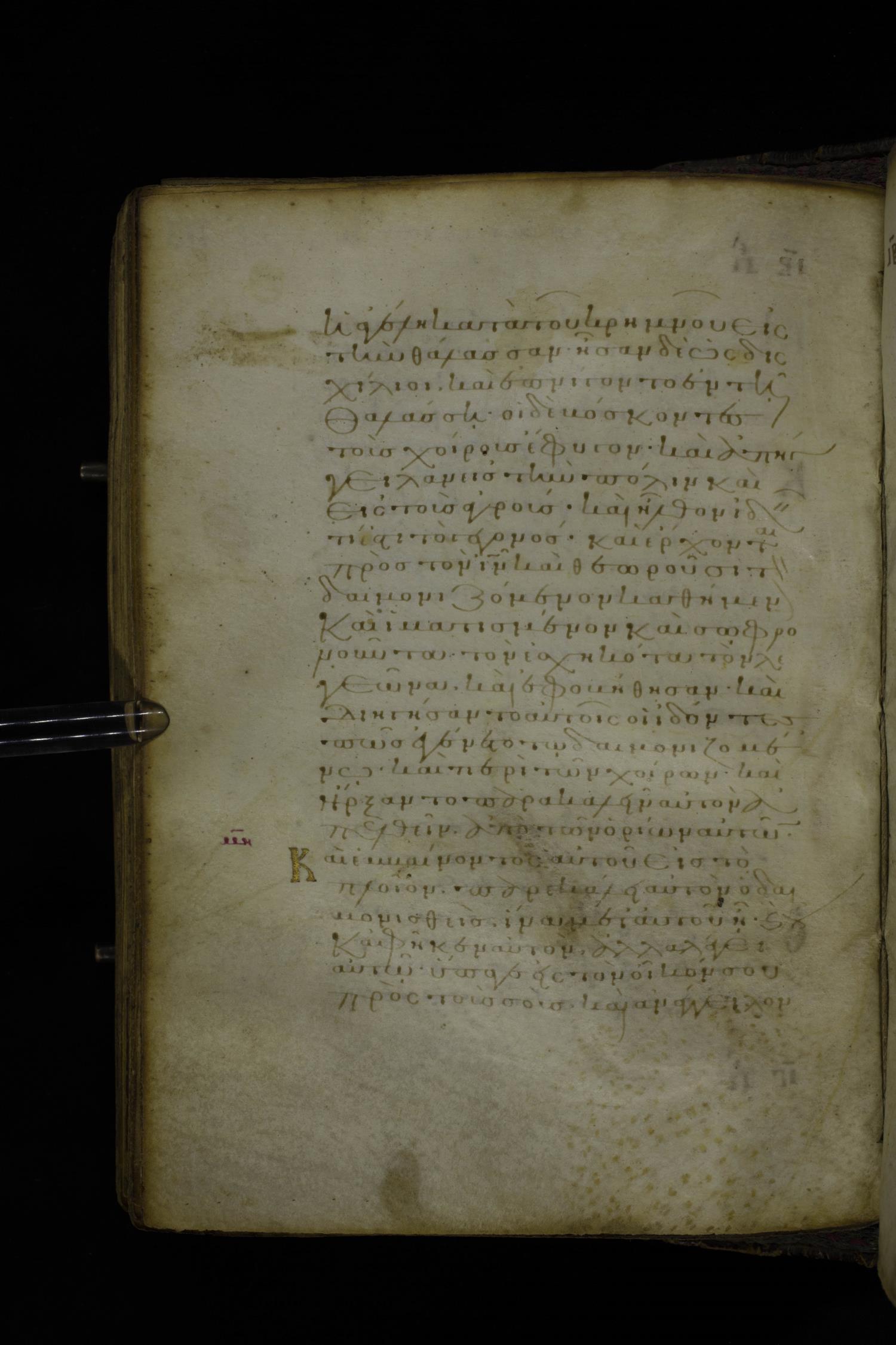 Twelfth century minuscule of the Gospel on parchment; 305 leaves, 1 column, 24 lines per column. Images were taken at the National Library of Greece in Athens.